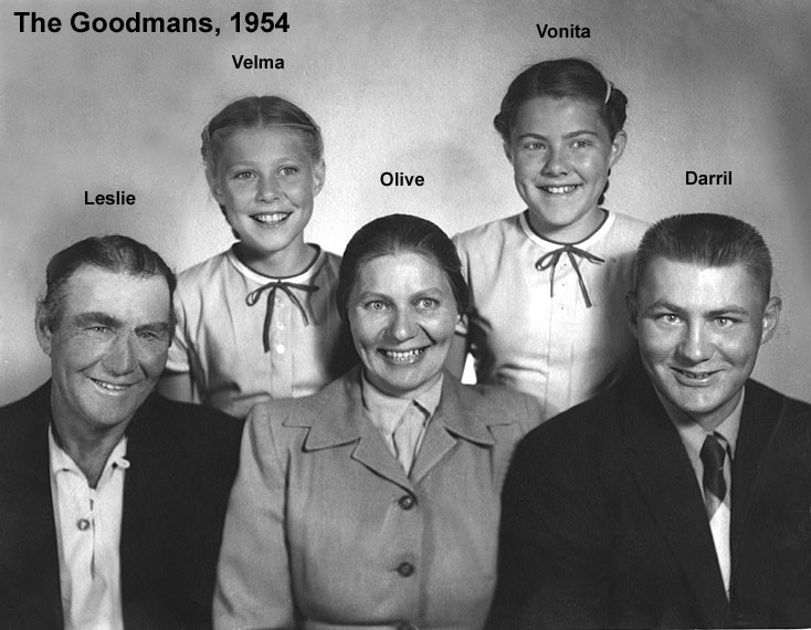 The 1950 U. S. Census taken on April 28, 1950, shows Leslie Goodman (age 46) born in Nebraska to United States-born parents, and with 4 years of High School, is a married Edgerman at a Saw Mill, and is living in 1031 Deadwood, City of Sturgis, Meade Co., SD. Living with him are: his wife, Olive S. Goodman (age 40) born in South Dakota; his son, Darril Goodman (age 12) born in South Dakota; his daughter, Vonita Goodman (age 4) born in South Dakota; and his daughter, Velma Goodman (age 3) born in South Dakota.