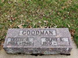 The 1940 U. S. Census taken on April 12, 1940, shows Leslie O. Goodman (age 36) born in Nebraska, and 5 years ago was living in Charles Mix Co., SD, and with 4 years of High School, is a married Farmer of a Farm who rents his farm worth $800 and is living in Iona Twp., Lyman Co., SD. Living with him are: his wife, Olive S. Goodman (age 30) born in South Dakota, and 5 years ago was living in Charles Mix Co., SD, and with 1 year of College; his son, Darril E. Goodman (age 2) born in South Dakota; and his daughter, Marjorie V. Goodman (age 5/12) born in South Dakota.
