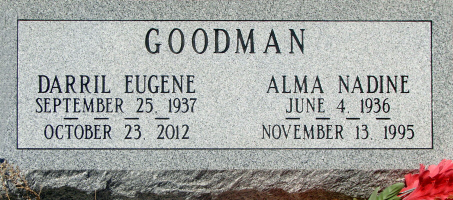 - Darril Eugene Goodman: Born September 25, 1937, in Geddes, Charles Mix Co., SD; Died October 23, 2012, at Gila Regional Hospital, Silver City, Grant Co., NM (age 75). Buried in Mountain View Cemetery, Lordsburg, Hidalgo Co., NM. Married (1) December 25, 1960, in Socorro Co., NM, to Alma Nadine Taylor; Born June 4, 1936, in Quemado, Catron Co., NM; Died November 13, 1995, in Lordsburg, Hidalgo Co., NM (age 59). Buried in Mountain View Cemetery, Lordsburg, Hidalgo Co., NM. Married (2) November 21, 1998, in Unknown, to Edna Ruth (Robertson) (Hix) (Owens) Green: Born August 18, 1934, in Warrensburg, Johnson Co., MO; Died October 3, 2002, at Gila Regional Medical Center, Silver City, Grant Co., NM (age 68). Buried in Mountain View Cemetery, Deming, Luna Co., NM. Married (3) Unknown, to Sarah Kamalangoneb Unknown: Born Unknown.