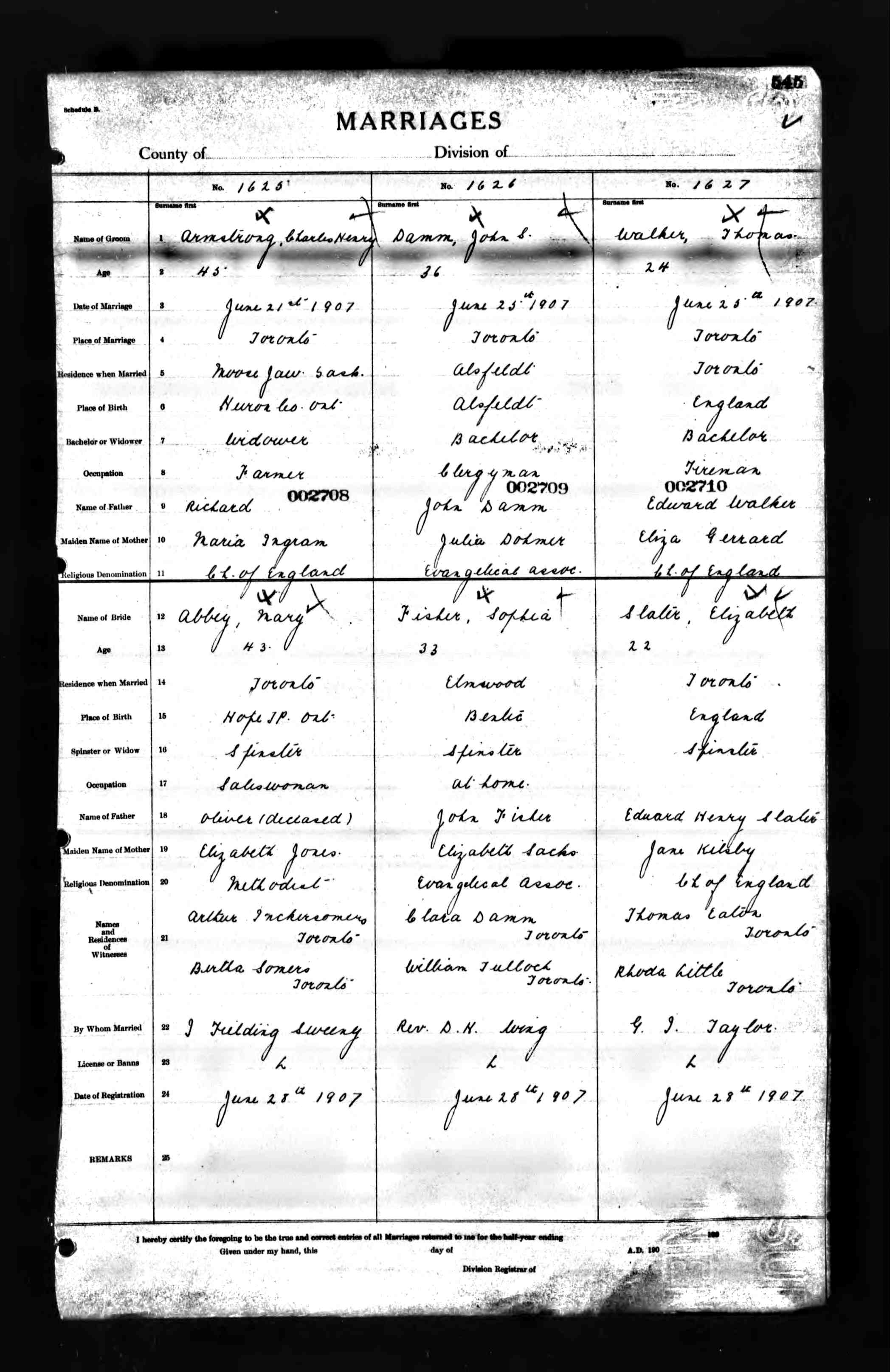 Charles Henry Armstrong and Mary L. Abbey were married June 21, 1907, in York, Ontario, Canada.