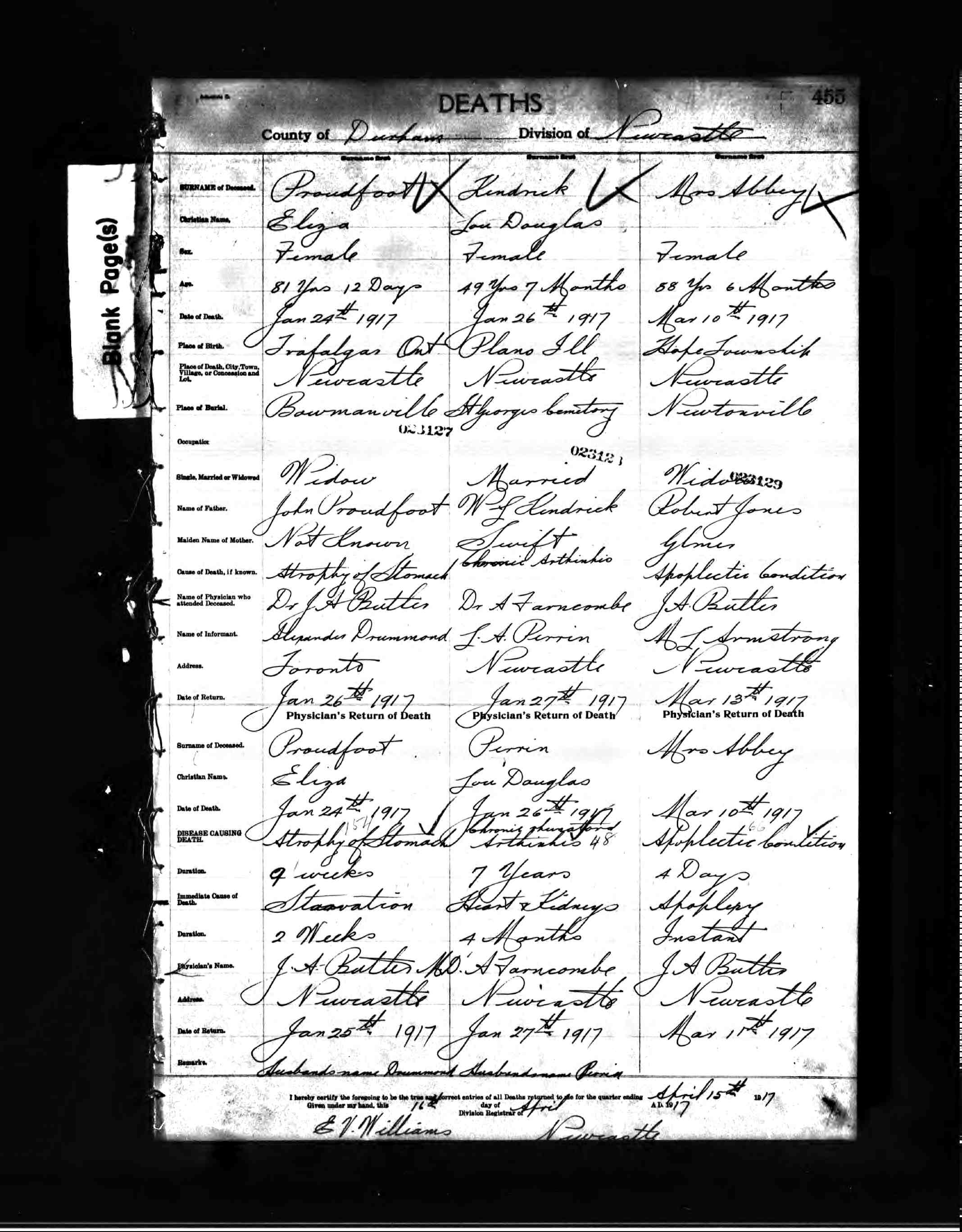 Elizabeth (Jones) Abbey died March 10, 1917, in Newcastle, Hope Twp., Durham Co., Newcastle District, Ontario, Canada, at age 88. Buried in Lakeview Cemetery, Lot 7, Concession 2, of the former Clarke Township, Newtonville, Ontario, Canada.