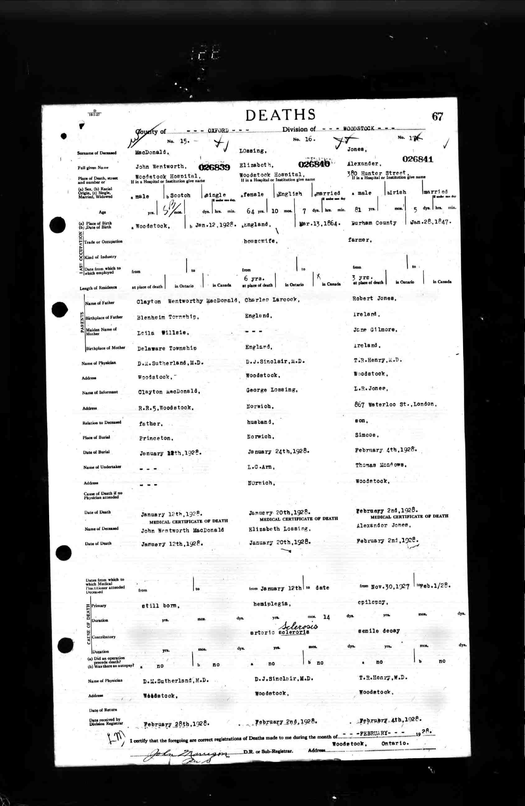 Death Certificate for Alexander Jones, brother of Elizabeth Jones, showing parents to be Robert Jones of Ireland and Jane Gilmore of Ireland: