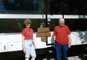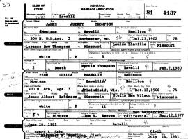 In 1923, bachelors Oran Ralph Abbey and his friend, James Audrey "Jimmy" Thompson, took a long trip to the western states. Oran kept a diary of their experiences while traveling, and years later the original transcription was provided by Kay Koslan. Leigh Larson revised it in 2023 using Oran's exact spelling and punctuation. Click on the image above for the PDF document of Oran's diary. Jimmy is: James Audrey Thompson (born July 23, 1902, in Rochester Twp., Andrew Co., MO; died September 25, 1981, at Marcus Daly Memorial Hospital, Hamilton, Ravalli Co., MT). Jimmy married Myrtle M. Holliday.
