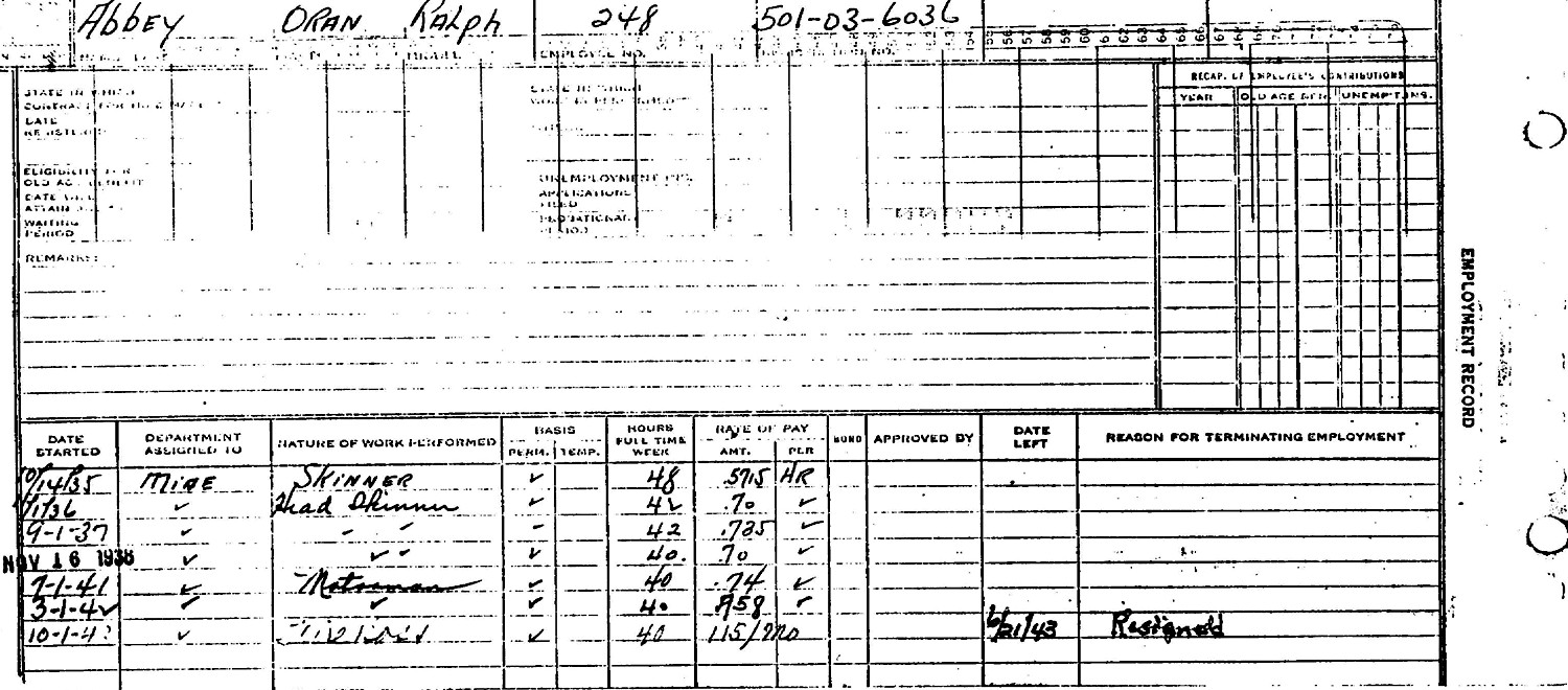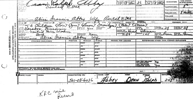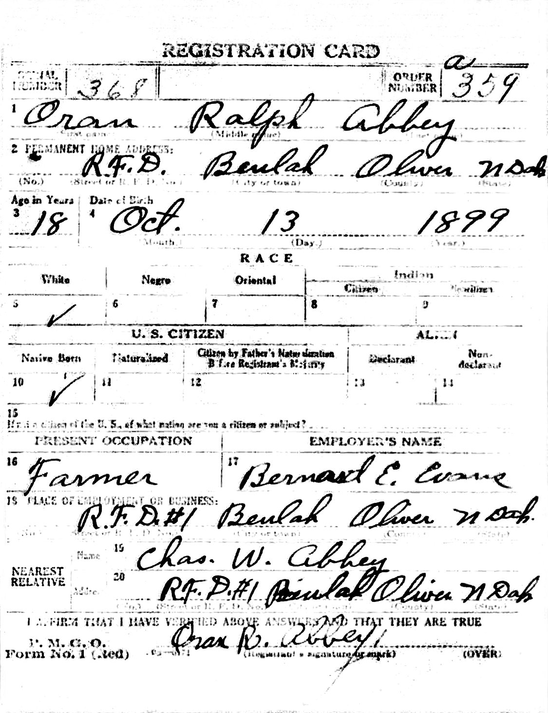 The WWI Draft Registration Report dated September 12, 1918, shows Oran Ralph Abbey (age 18) born October 13, 1899, is a Farmer employed by Bernard E. Evans, and is living at R. F. D. #1, Beulah, Oliver Co., WI. His nearest relative is Chas. W. Abbey of the same address.