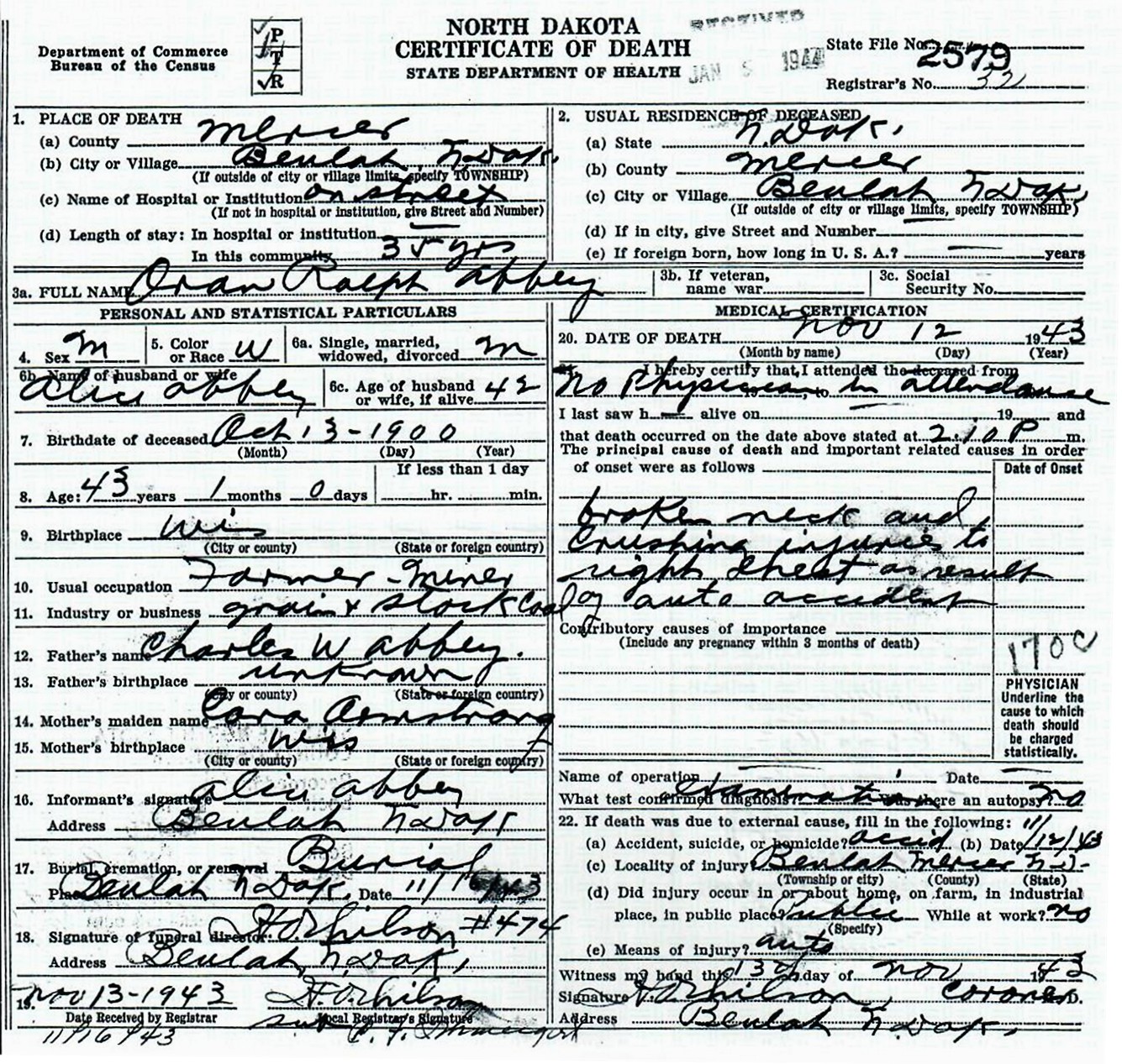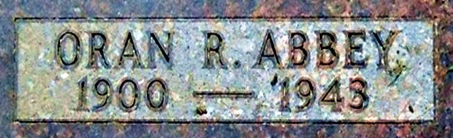 Oran Ralph Abbey was born October 13, 1899, in Milladore Twp., Wood Co., WI, and died November 12, 1943, in a car accident about a half mile from his farm, south of the Village of Beulah, Mercer Co., ND, at age 44. Buried in Saint Joseph Catholic Cemetery, Mercer Co., ND. He is the son of Charles Washington Abbey of Byron Twp., Fond du Lac Co., WI, and Cora Adella Armstrong of Baraboo, Sauk Co., WI.