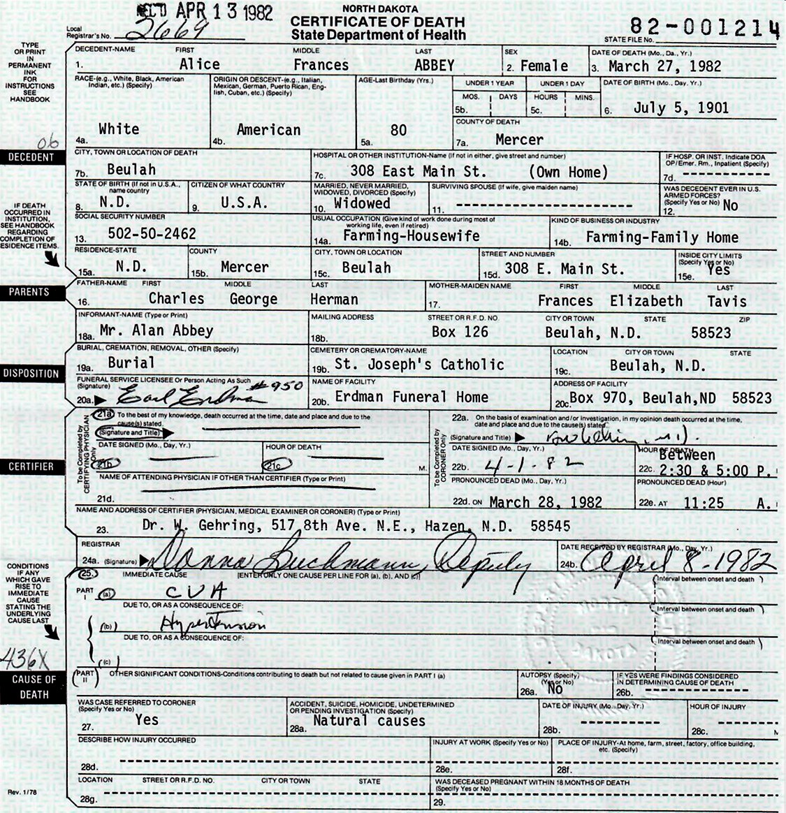 - Alan Lee Abbey: Born September 25, 1941, in the Village of Beulah, Mercer Co., ND; Died December 19, 2020, at Missouri Slope Lutheran Care Center, Bismarck, Burleigh Co., ND (age 79). Buried in Saint Joseph Catholic Cemetery, Mercer Co., ND. Married April 25, 1964, at St. Joseph Catholic Church, Beulah, Mercer Co., ND, to Janice Pearl "Jan" Bowers/Welk: Born November 25, 1944, in Portland, Multnomah Co., OR.