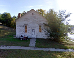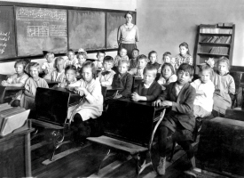 Alice Frances Herman as a teacher, standing in her classroom, about 1921. The other teacher, sitting in the back row next to the bookcase, is Unknown. Could it be Iris A. Aker, who was born 1904 in North Dakota, and married Theo. H. Zorn, a banker in Beulah, in 1931? The picture on the right shows the condition of this building about 2019. The classroom photo is courtesy of Kay Koslan.