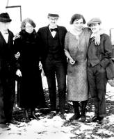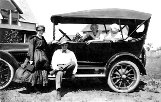 The Herman group, Left to Right: Philomena Bertha "Minnie" Tavis, Rebecca Margaret (Albers) Gentz, Alice Frances Herman, John Leslie "Joe" Easton, and Wilfred August Herman, North Dakota, about 1920. Photo courtesy of Kay Koslan.