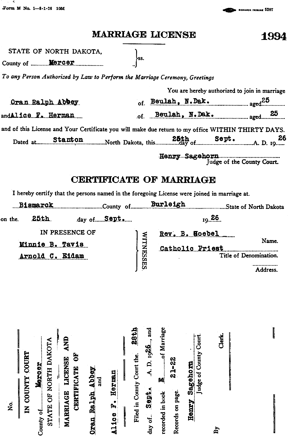 Oran Ralph Abbey (age 26), a bachelor, and Alice Frances Herman (age 25), a maiden, were married September 25, 1926, in Bismarck, Burleigh Co., ND.