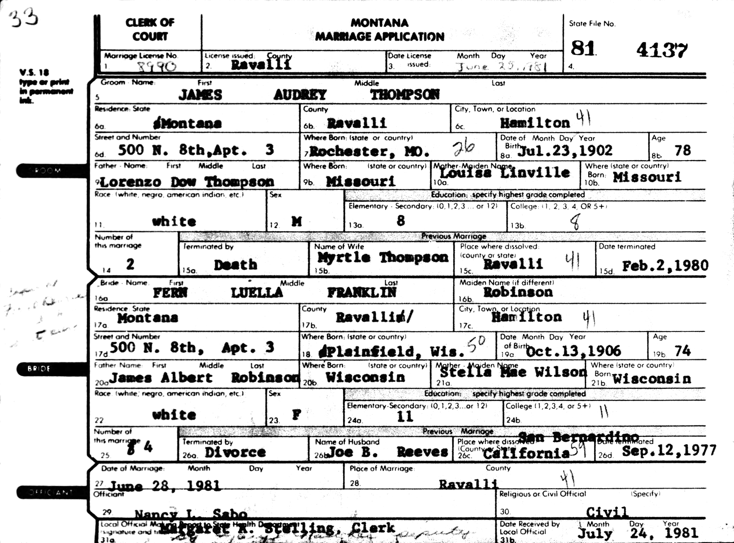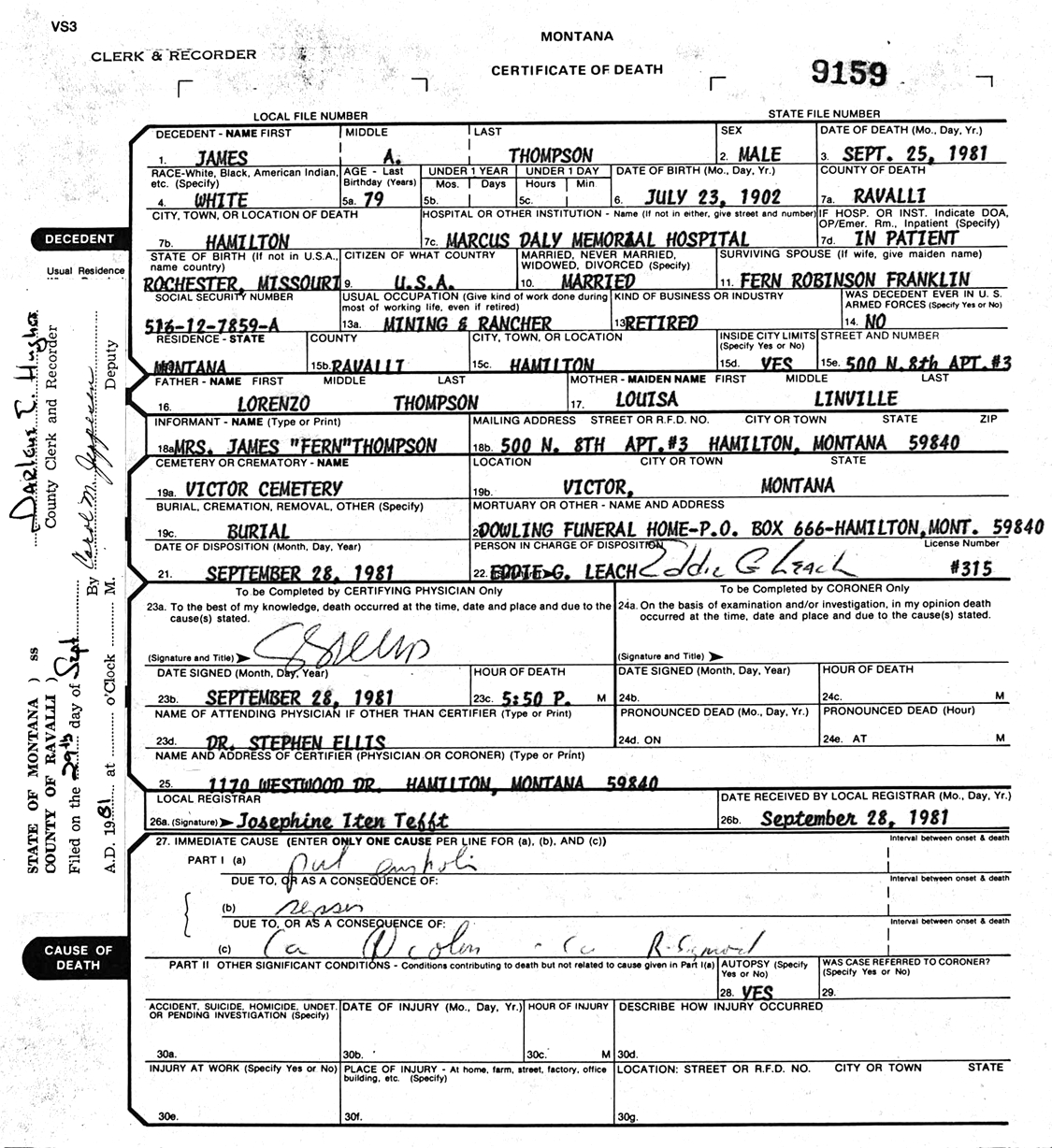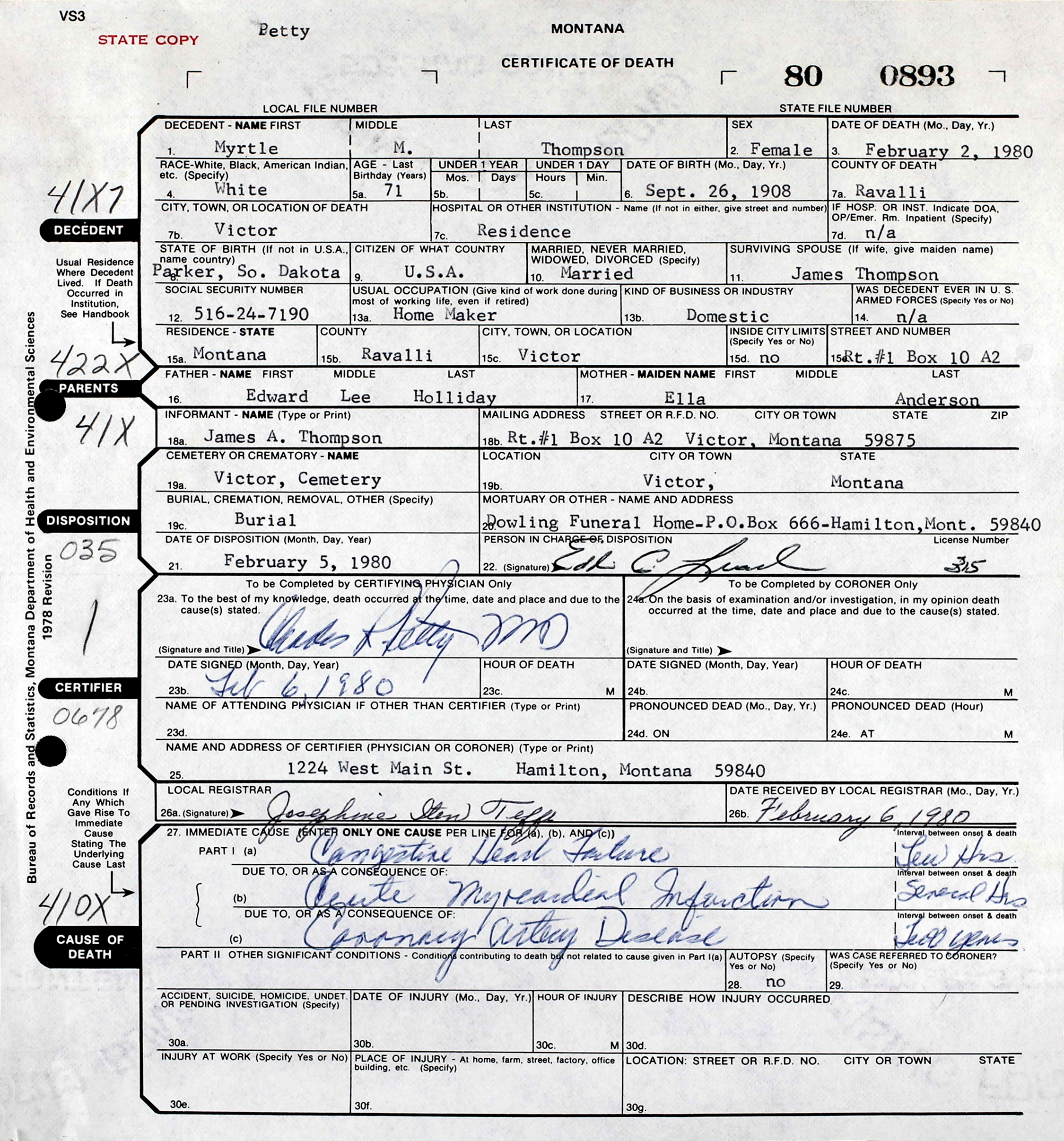 James Audrey "Jim" Thompson and Myrtle M. (Holliday) Thompson are buried Buried in Victor Cemetery, Ravalli Co., MT. Thanks to Find-A-Grave for making this image available.