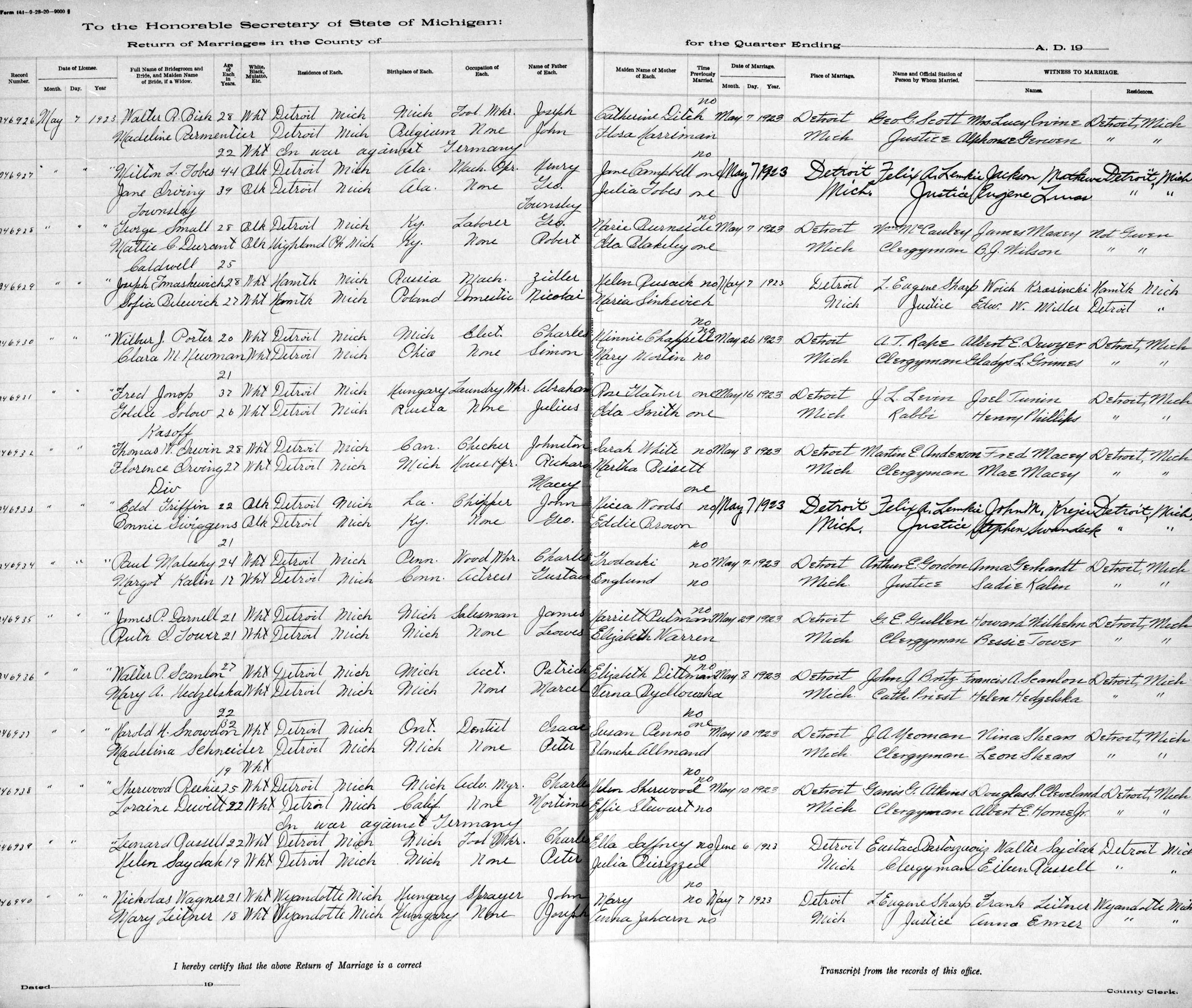 Paul Joseph Malesky (age 24), a Woodworker, and Margot Kalin (age 17), an Actress, were married May 7, 1923, in Detroit, Wayne Co., MI. Her parents are Gustave Kalin and Englund Unknown.