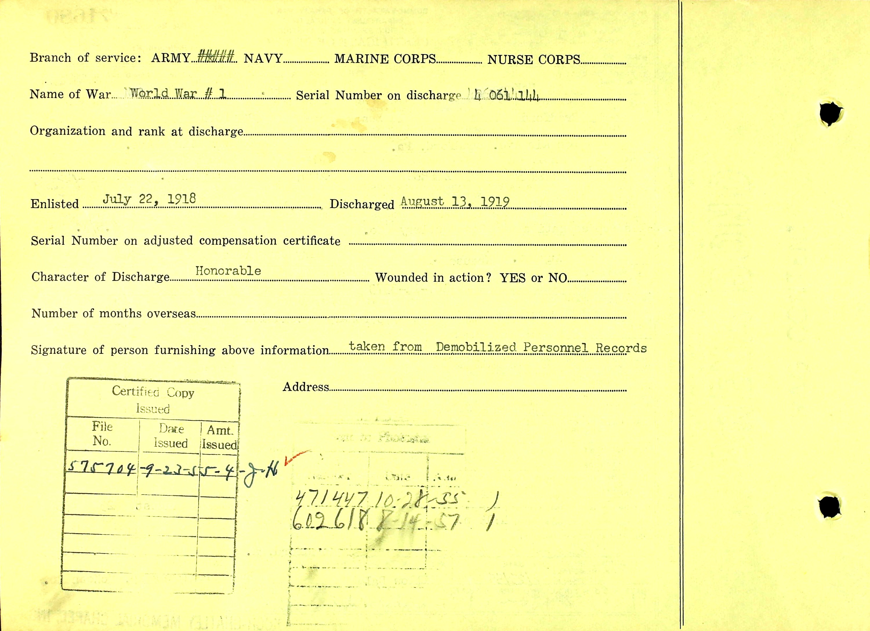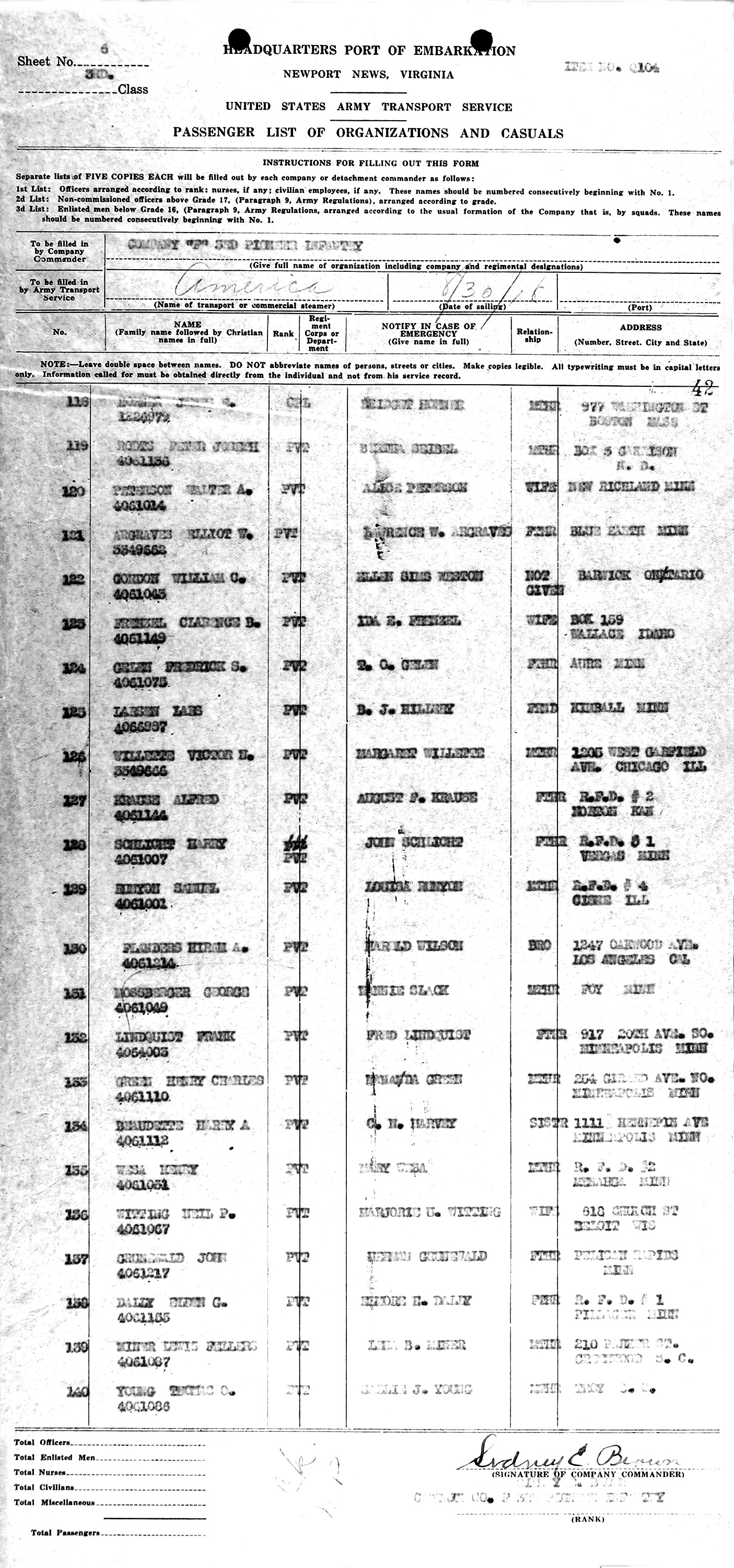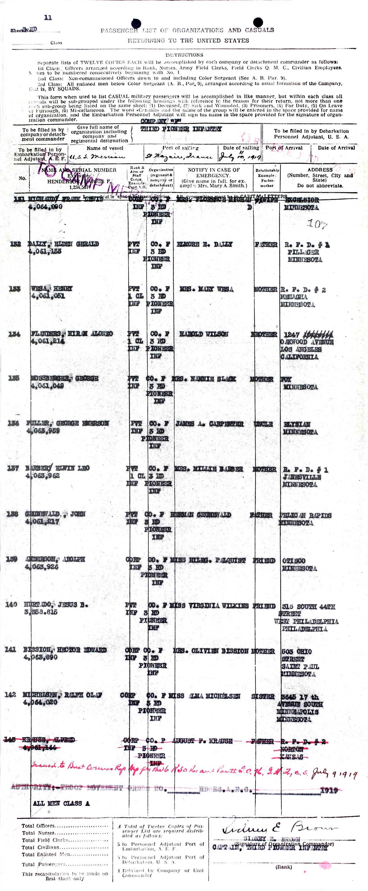 Alfred Krause sailed from Newport News, VA, on August 30, 1918, and returned to the United States from France, sailing from St. Nazaire, France, on July 11, 1919.