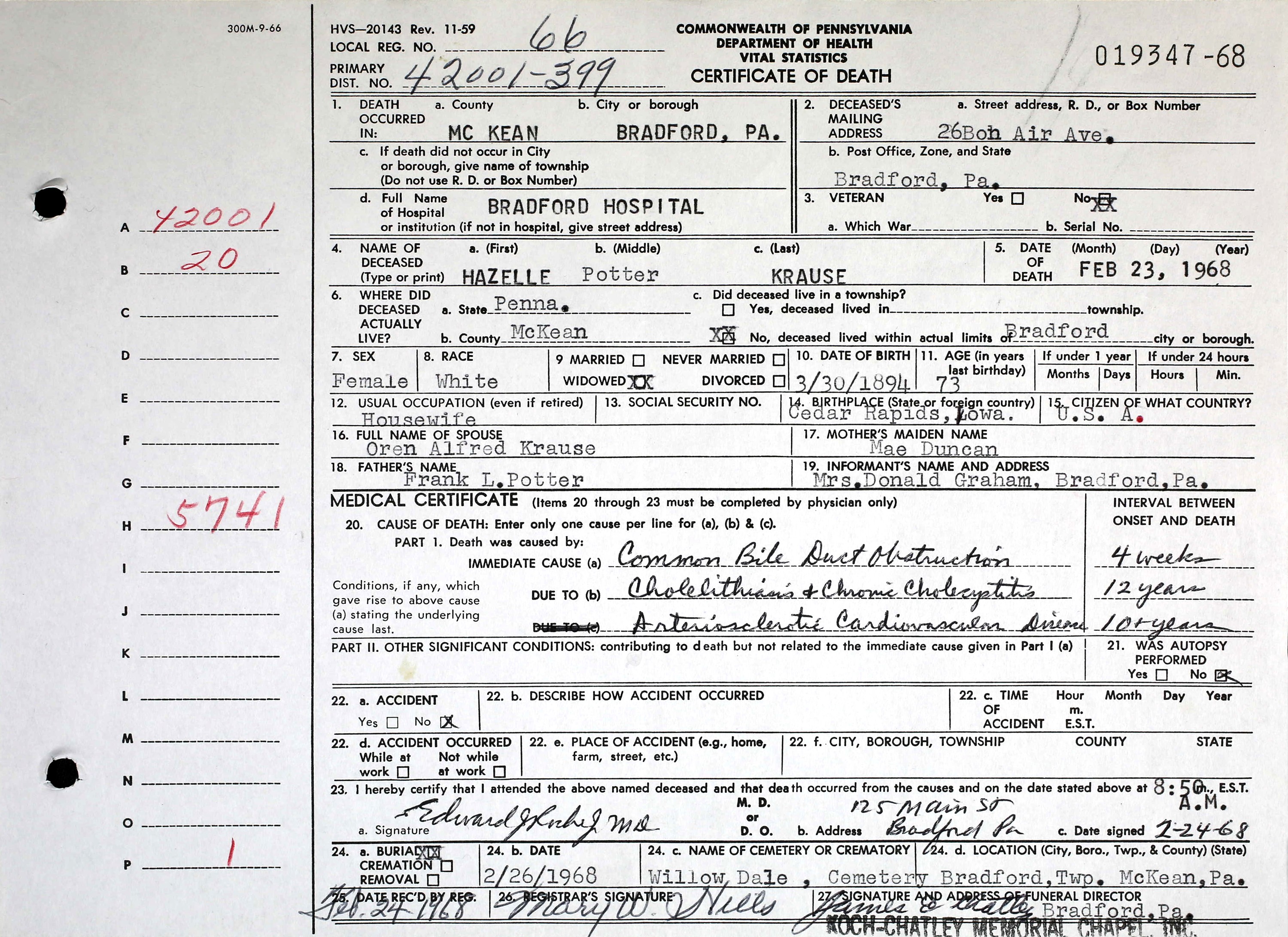 Hazelle Blanche (Potter) Krause died February 23, 1968, at Bradford Hospital, Bradford, McKean Co., PA, at age 74. Buried in Willow Dale Cemetery, 30 Hedgehog Lane, Bradford, McKean Co., PA.