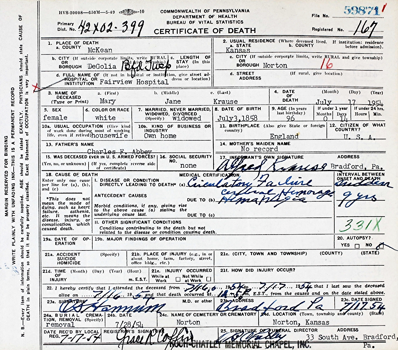 Mary Jane (Abbey) Krause died July 17, 1954, in the hospital of Fairview Rest Home, Degolia, Bradford Twp., McKean Co., PA, at age 94. Buried in Spring Green Cemetery, Spring Green Twp., Furnas Co., NE.