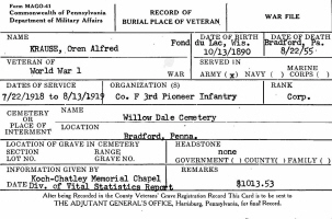 Oren Alfred "Al" Krause was born October 23, 1890, in Fond du Lac Co., WI, and died August 23, 1955, at his home, City of Bradford, McKean Co., PA, at age 64. Buried in Willow Dale Cemetery, 30 Hedgehog Lane, Bradford, McKean Co., PA. He is the son of August Ferdinand Krause of Schwabach, Prussia, Germany, and Mary Jane Abbey of Clarke Twp., Durham Co., Canada West. Alfred was a WWI Veteran. Corporal, U.S. Army, Co. F, 3rd Pioneer Inf., 7/22/1918 - 8/13/1919.
