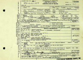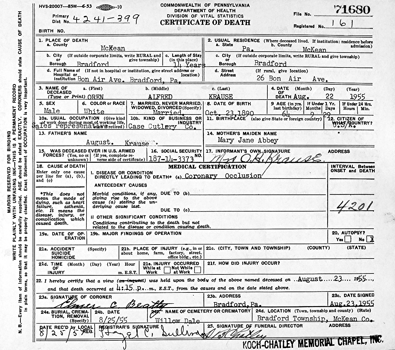 Oren Alfred Krause died August 23, 1955, at his home in the City of Bradford, McKean Co., PA, at age 64. Buried in Willow Dale Cemetery, 30 Hedgehog Lane, Bradford, McKean Co., PA.