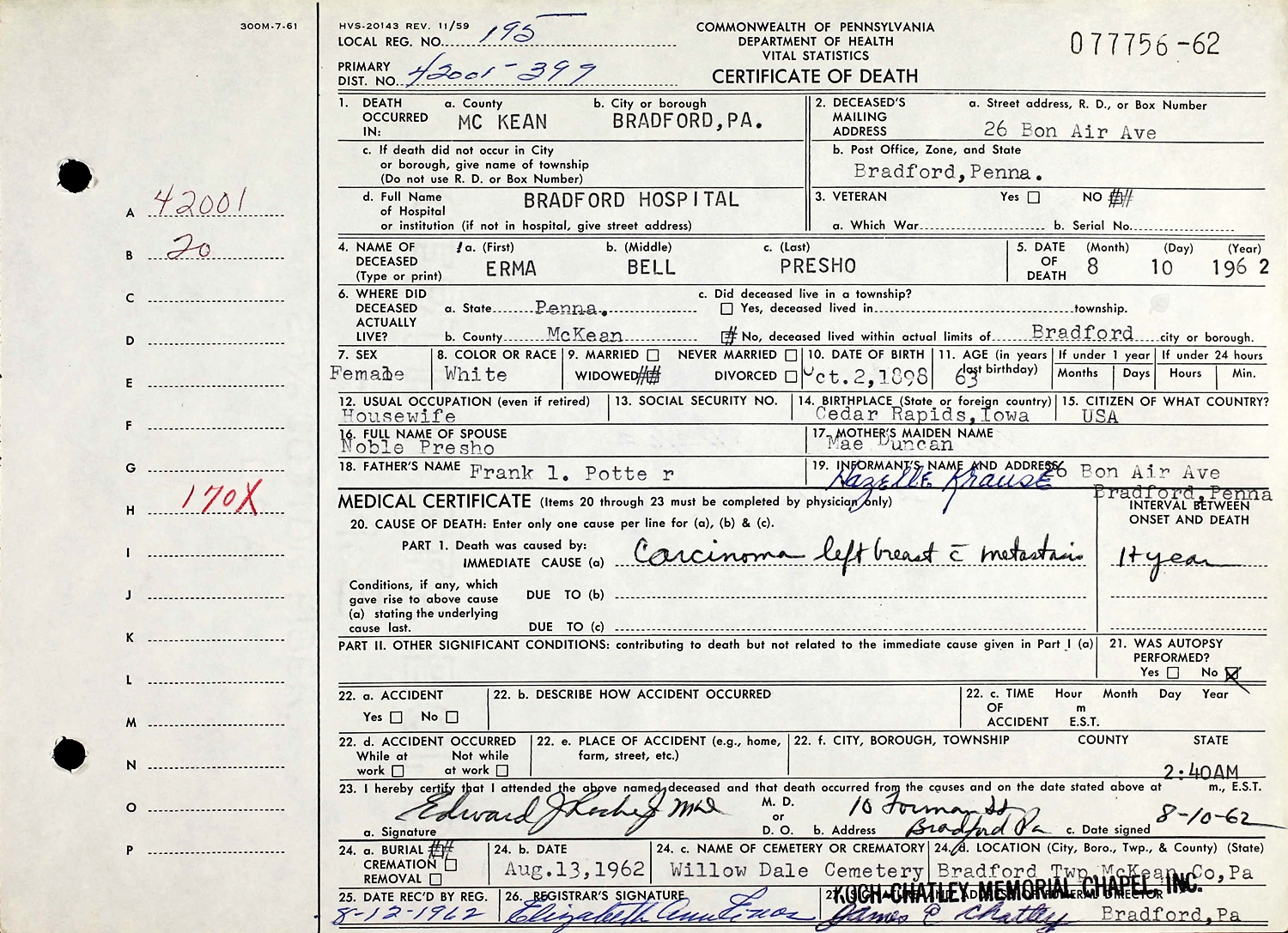Mrs. Erma Bell Presho, 63, of 26 Bon Air Ave., a resident of this community for the past five years, died at 3:40 a.m. Friday at the Bradford Hospital. She had been ill for the past two years and a patient at the hospital since March 15. Mrs. Presho was born Oct. 2, 1898, at Cedar Rapids, Iowa, daughter of Mr. and Mrs. Frank L. Potter. She lived at Montreal for a number of years, and following the death of her husband, Noble Presho, in 1957 and came to Bradford to make her home with her sister, Mrs. Hazel Krause. She was a member of the Church of England, Montreal. Also surviving is another sister, Mrs. Otto Zeighrt of Minneapolis, Minn.; a brother, Ralph Potter of Bellflower, Calif.; a son, Robert Presho, of Montreal; two grandchildren; her mother, Mrs. Mae Potter of Bradford, and several nieces and nephews. Friends will be received at the Koch-Chatley Memorial Chapel beginning at 3 p.m. today. Funeral services will be held at 10:30 a.m. Monday at the Chapel, with the Rev. Douglas Wright officiating. Burial will be in the Willow Dale Cemetery.