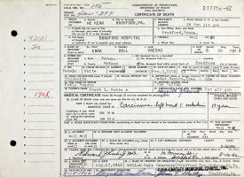 Erma Belle Potter died August 10, 1962, at Bradford Hospital, Bradford, McKean Co., PA, at age 63. Buried in Willow Dale Cemetery, 30 Hedgehog Lane, Bradford, McKean Co., PA.