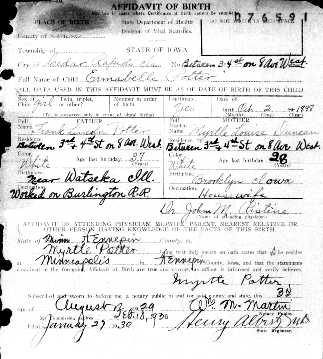 Hazelle Blanche Potter was born March 30, 1893, in Cedar Rapids, Linn Co., IA.
