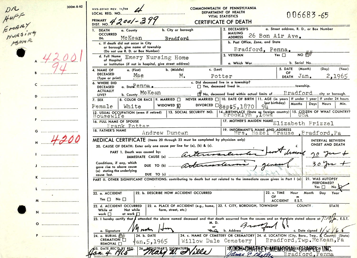 Myrtle Louise "Mae" (Duncan) Potter died January 2, 1965, at Emery Nursing Home, Bradford, McKean Co., PA, at age 94. Buried in Willow Dale Cemetery, 30 Hedgehog Lane, Bradford, McKean Co., PA.