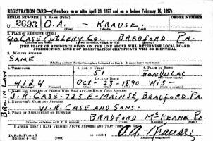 The WWII Draft Registration Report taken on April 27, 1942, shows O. A. Krause (age 51) born October 23, 1890, in Fond du Lac, WI, is working for W. R. Case and Sons. His contact person is his brother-in-law, J. R. Case, 723 E. Main St., Bradford, PA. His draft board is located in Collegeville, Montgomery Co., PA.