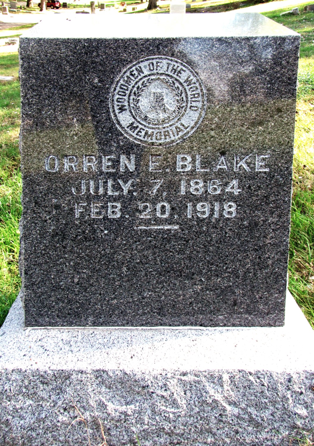 Orren E. Blake is buried in Floyd Cemetery, Sioux City, Woodbury Co., IA. It shows a Woodmen Of The World Memorial. Thanks to Find-A-Grave for making this image available.