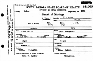 - Clara Evelyn A. Breunsbach: Born May 18, 1912, in Illinois; Died September 18, 2002, in Lakewood, Jefferson Co., CO (age 90). Married November 3, 1930, in Elk Point, Union Co., SD, to a divorced man, Rex Alvin Smith: Born May 27, 1895, in Mound City, Holt Co., MO; Died November 28, 1967, in Fremont, Dodge Co., NE (age 72). Buried in Ridge Cemetery, Fremont, Dodge Co., NE. He was first married September 5, 1925, in Yankton, Yankton Co., SD, to Emily E. Peacher: Born about 1905 in Columbia, MO; Died Unknown. He was an Insurance Broker in 1930. In 1940 he was State Manager for an Insurance Company and living in Lincoln, NE. Emily's parents are Charles Peacher (born about 1865), and Luetta March (born about 1876) of Missouri.