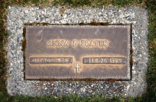 Anna Barbara (Steinman) (Shirey) Slater died February, 1995, in Bremerton, Kitsap Co., WA (age 96). Buried in Miller-Woodlawn Memorial Park, Bremerton, Kitsap Co., WA.