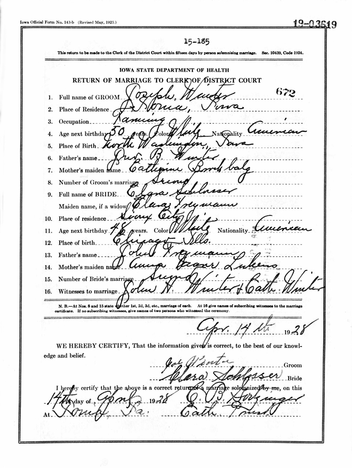 Joseph "Joe" Winters and Clara H. (Freymann) (Blake) Schlosser were married April 14, 1928, in Ionia, Chickasaw Co., IA.