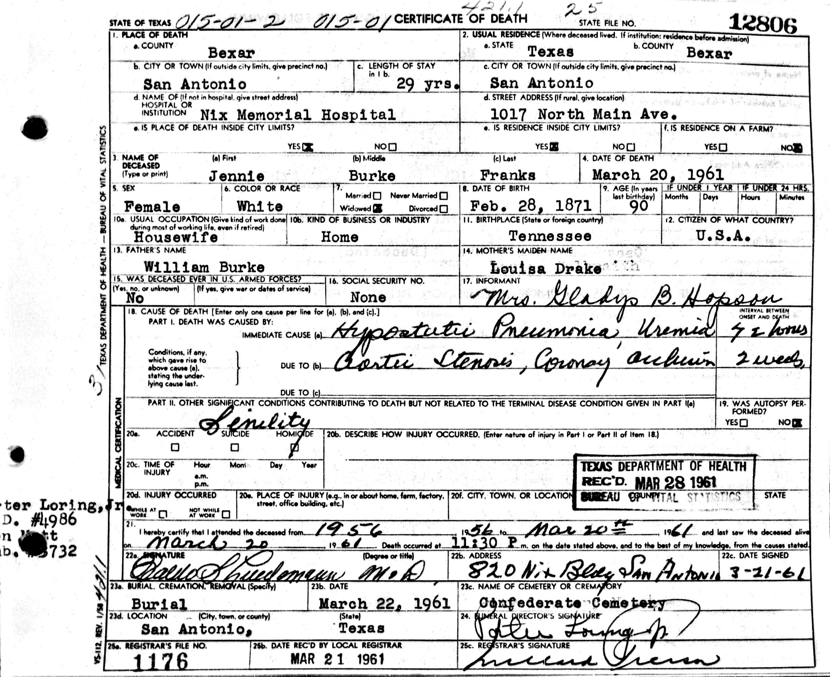 Jenine L. "Jennie" (Burke) Franks died March 20, 1961, in Nix Memorial Hospital, San Antonio, Bexar Co., TX, at age 90. Buried in Confederate Cemetery, San Antonio, Bexar Co., TX.