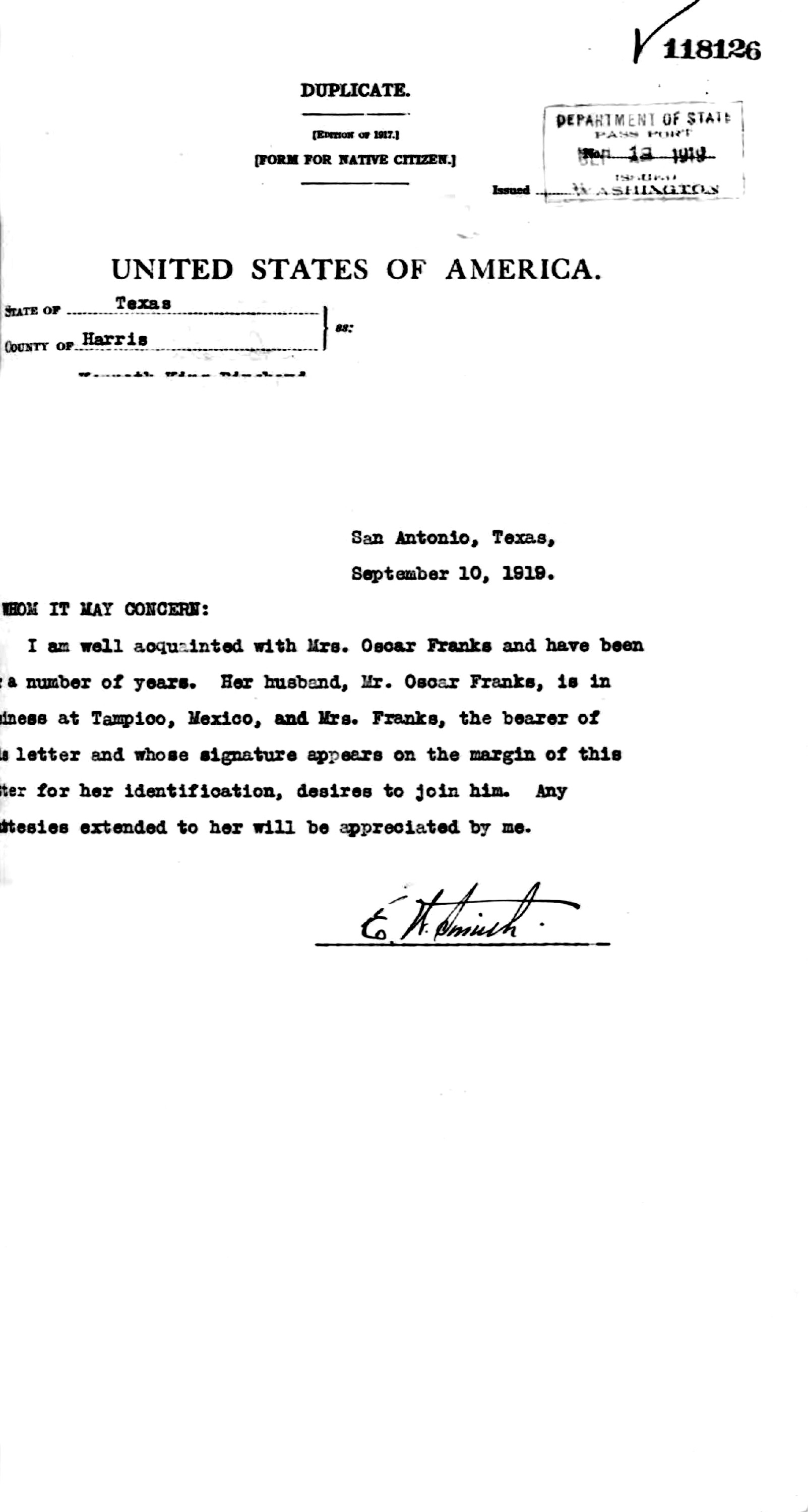 In January, 1899, Oscar Bertrand Franks and Jenine L. "Jennie" (Burke) Franks were living in Eagle Pass, Maverick Co., TX.