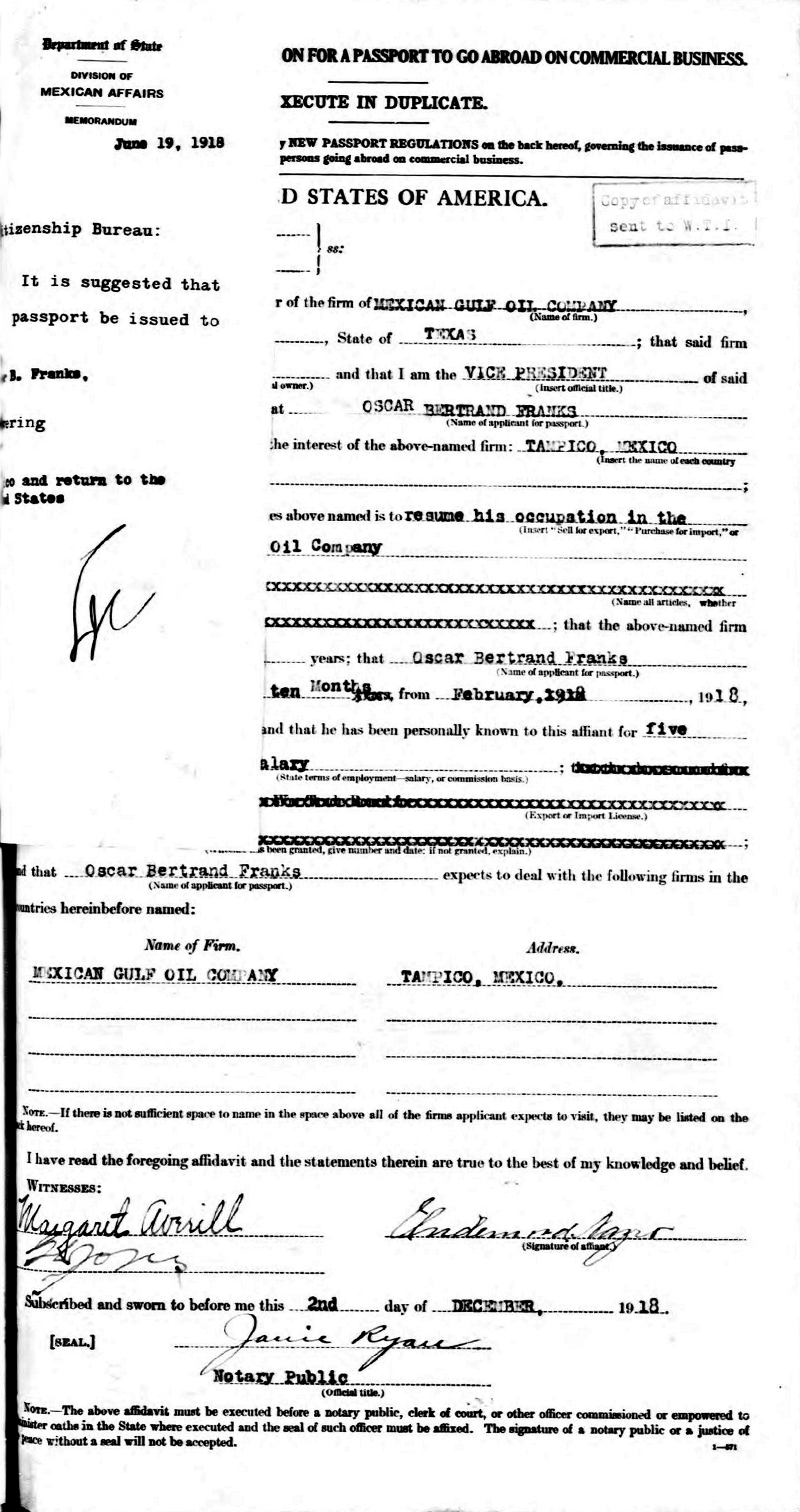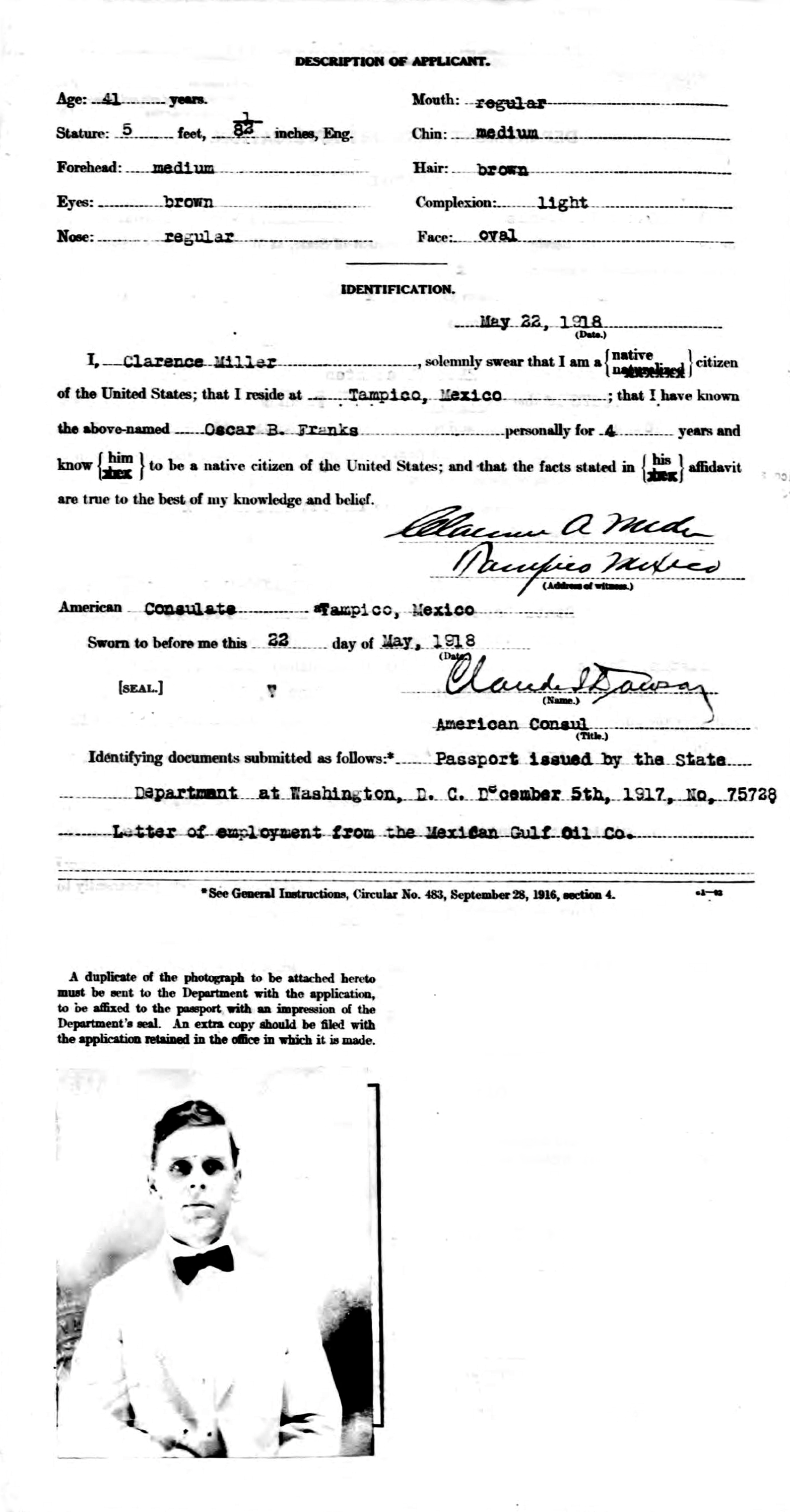 The WWI Draft Registration Report dated September 12, 1918, shows Oscar Bertrand Franks, age 41, born October 16, 1876, is an Oil Accountant for Gulf Oil Company in Houston, Harris Co. TX. His nearest relative is Jennie B. Franks .