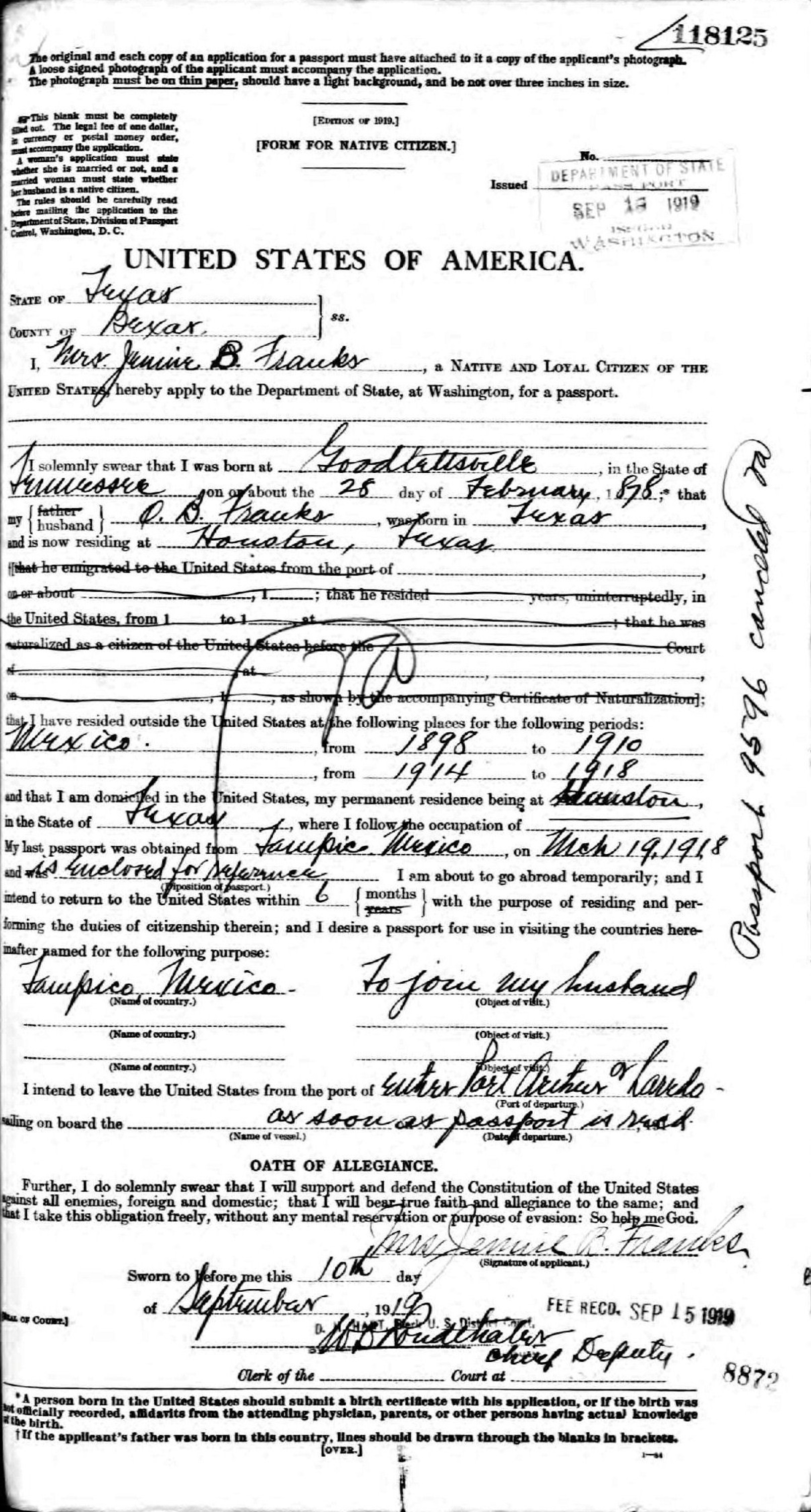 The 1940 U. S. Census taken on May 3, 1940, shows Jennie B. Franks (age 64) born in Tennessee, and 5 years ago was living in the Same House, and with 4 Years of High School, and who owns her house worth $2,200 is a widowed Head of Household, and is living at 134 Justice Precinct 1, San Antonio, Bexar Co., TX.
