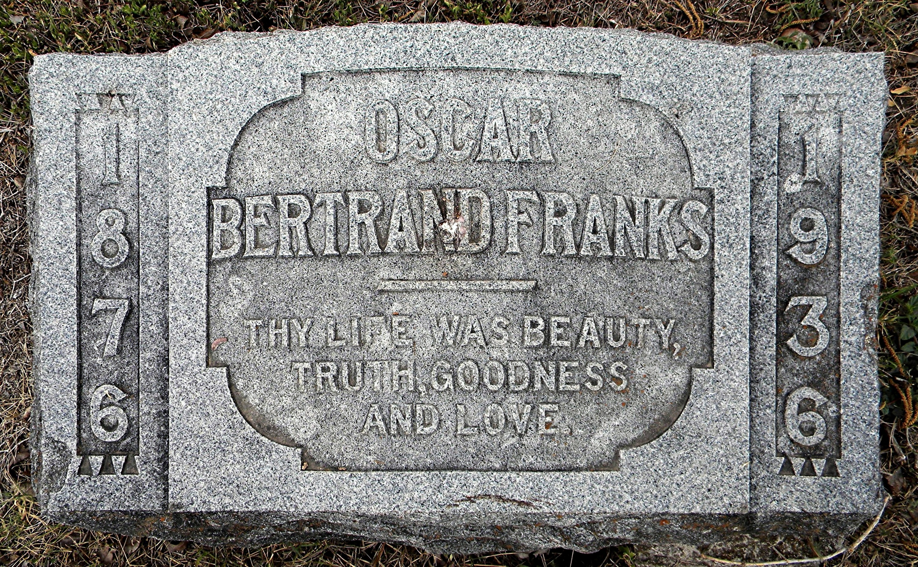 Oscar Bertrand Franks died December 18, 1936, at Nix Hospital, San Antonio, Bexar Co., TX (age 60). Buried in City Cemetery #4, San Antonio, Bexar Co., TX.