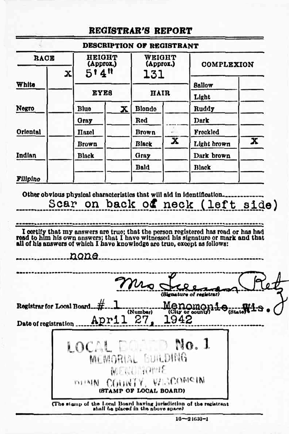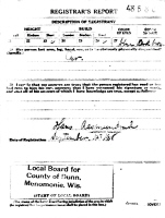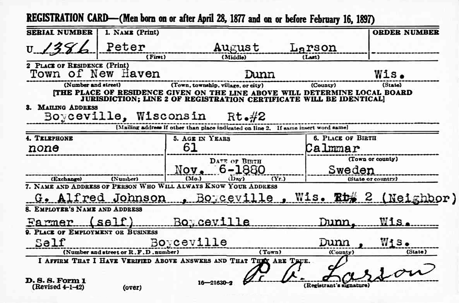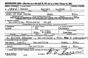 The WWII Draft Registration Report taken on April 27, 1942, shows Peter August Larson, age 37, born November 6, 1880, in Calmar, Sweden is a Farmer working for himself and is living in the Town of New Haven, Dunn Co., WI. His nearest relative is a neighbor, G. Alfred Larson.