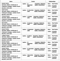 Paul Rebman Fischer was born June 21, 1862, in Freiburg, Königreich Sachsen (Saxony), Germany, was baptized June 29, 1862, in Katholisch, Grafenhausen Bonndorf, Waldshut, Baden, Germany, and died in Grafenhausen Bonndorf, Waldshut, Baden, Germany, at age Unknown. He is the son of Felix Fischer of Tiergarten, Baden-Wurttemberg, Ortenaukreis, Germany, and Theresia Pfeifer of Tiergarten, Baden-Wurttemberg, Ortenaukreis, Germany.