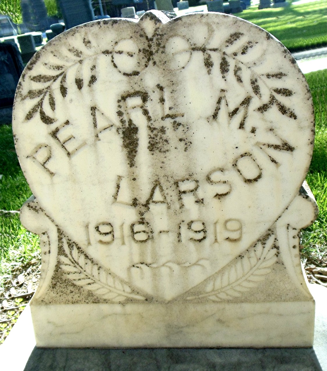 Pearl Marie Larson died August 10, 1919, at Children's Hospital, San Francisco, San Francisco Co., CA, at age 3. Buried in Plot Block 22, Lot 35, Grave 5, in Woodland Cemetery, Woodland, Yolo Co., CA.