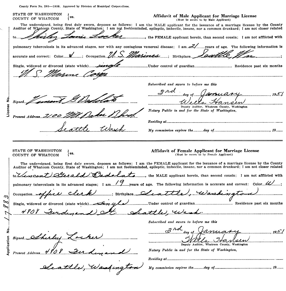 Vincent Gerald Badolato and Shirley Louise Locker applied for a marriage license on January 3, 1951, in Seattle, King Co., WA.