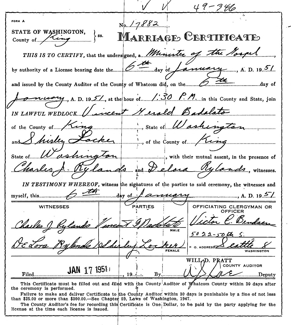 Vincent Gerald Badolato and Shirley Louise Locker were married January 6, 1951, in Seattle, King Co., WA.