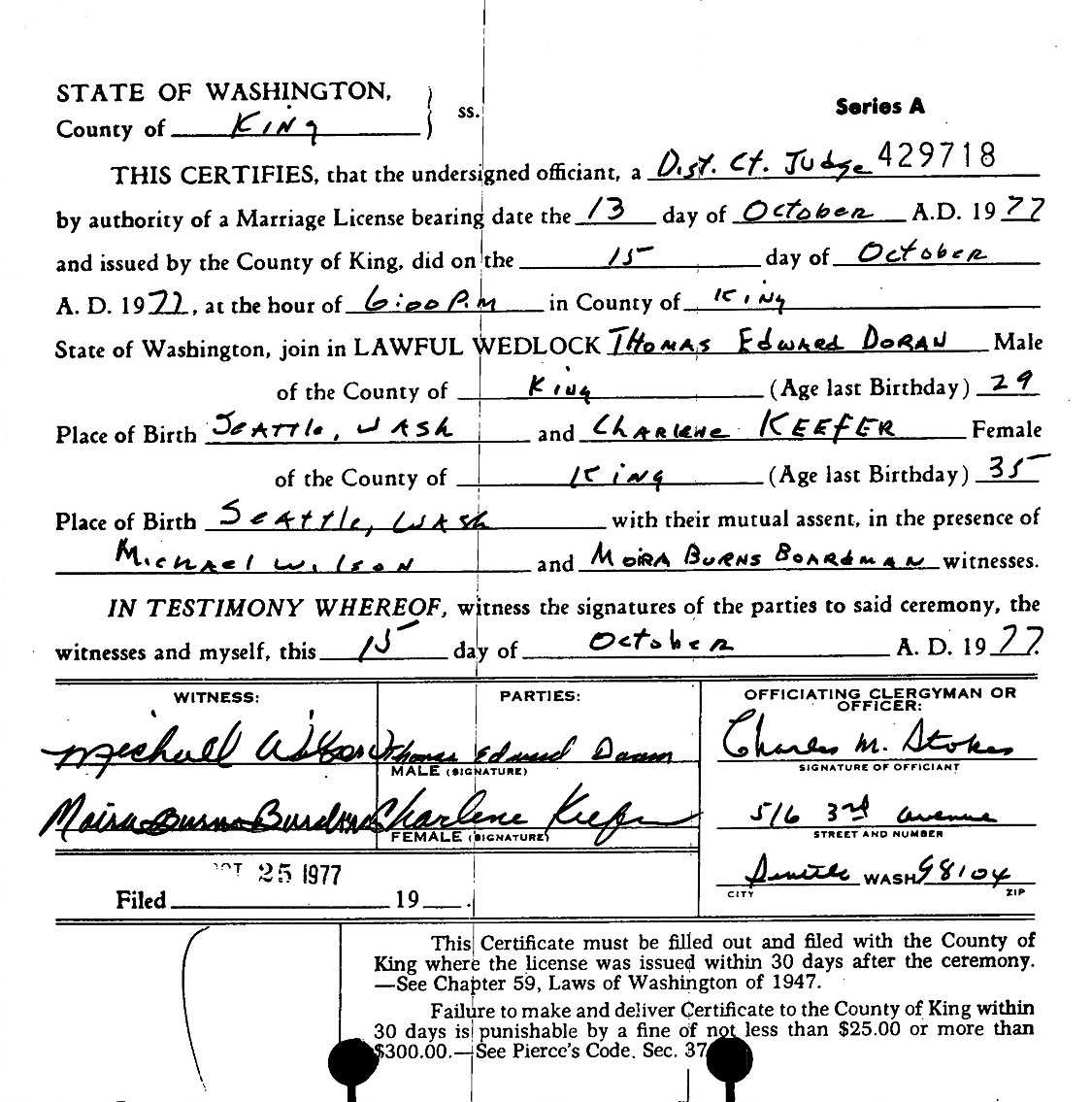 Thomas Edward "Tom" Doran and Charlene Marie (Bengston) Keefer were married October 15, 1977, in Seattle, King Co., WA.