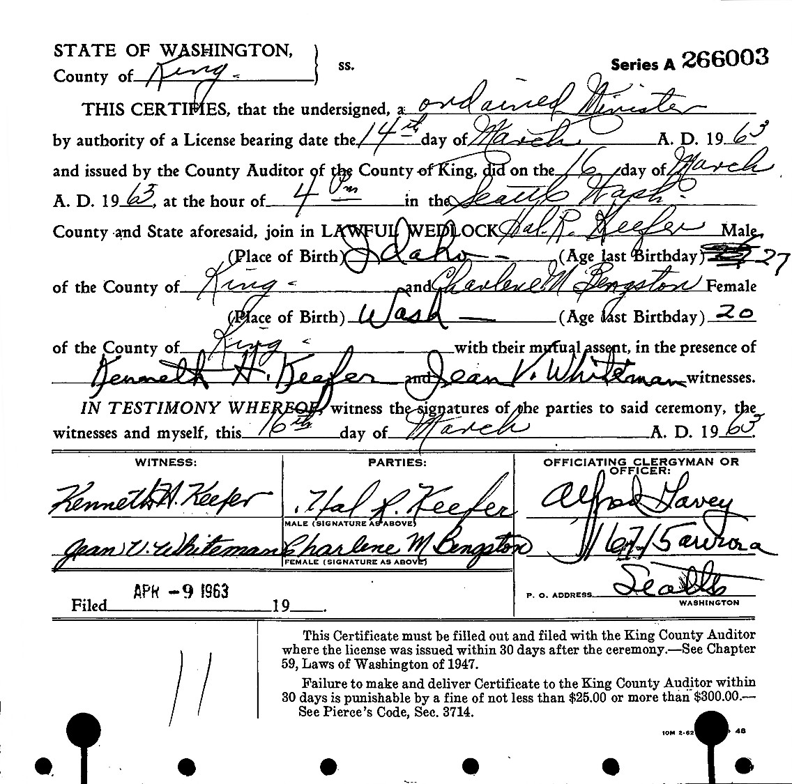 Hal Ray Keefer and Charlene Marie Bengston were married March 16, 1963, in Seattle, King Co., WA.