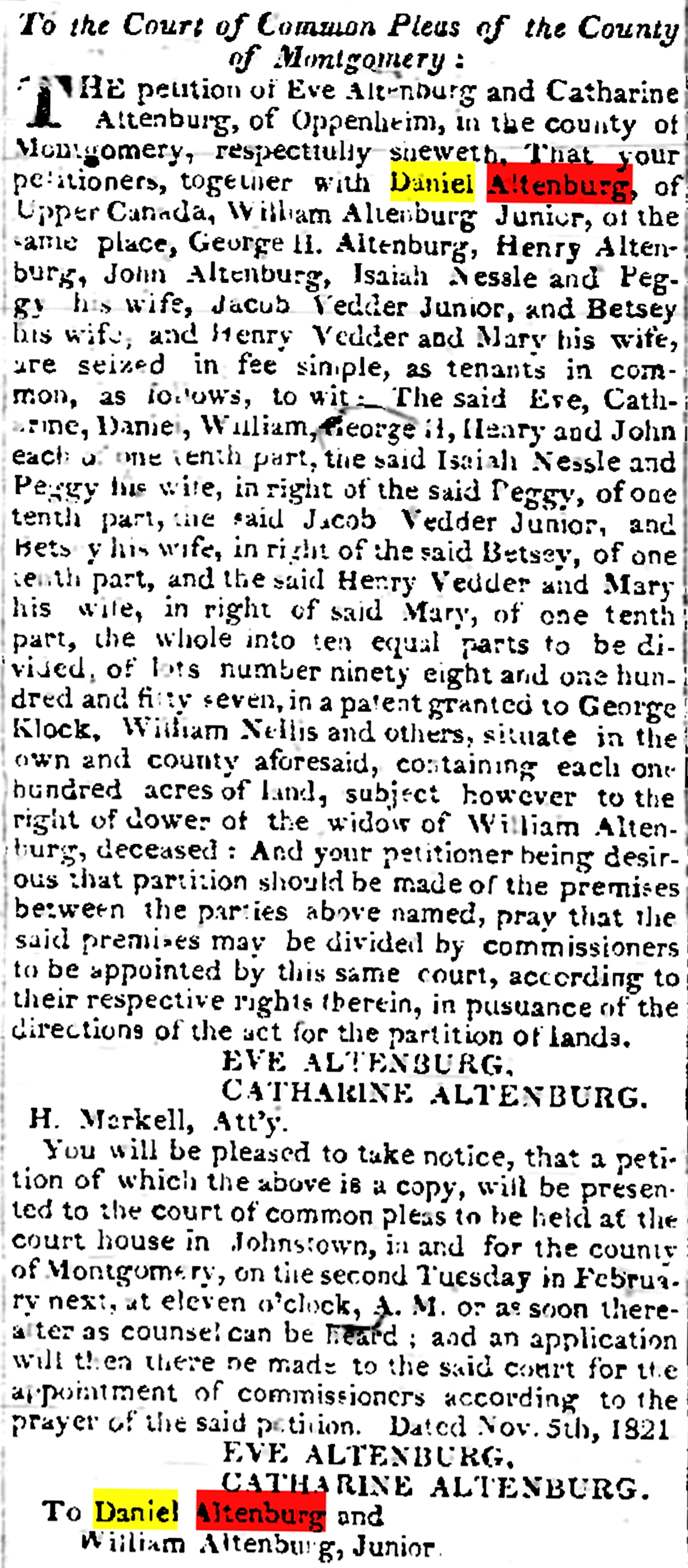 The 1821 Census for Haldimand Twp., Northumberland Co., Upper Canada, shows Daniel David Altenburg is the Head of Household. There are 1 Male age 16 - 60; 1 Female age 16 - 60; 2 Males under age 16; and 1 Female under age 16. There is no Tax Assessment. Daniel David Altenburg, born about 1788; Elizabeth (Fancher) Altenburg, born 1793; Jonathan William Altenburg , born June 14, 1815; Ephraim Fancher Altenburg, born 1818; and Mary Ann Altenburg , born June 10, 1821 .