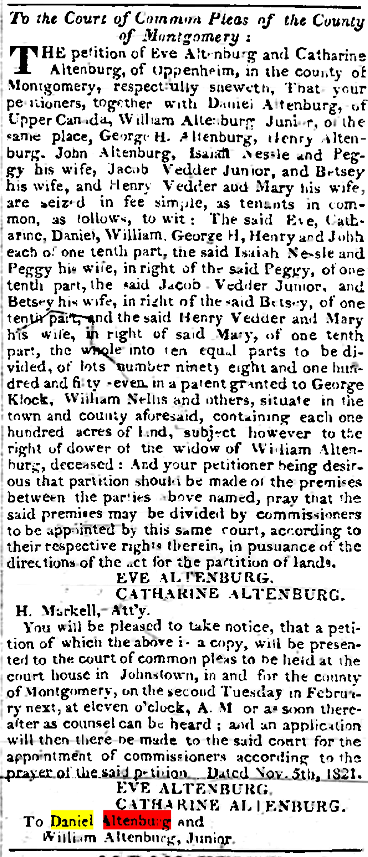 The 1820 Census for Haldimand Twp., Northumberland Co., Upper Canada, shows Daniel David Altenburg is the Head of Household. There are 2 Males age 16 - 60; 1 Female age 16 - 60; 2 Males under age 16; and 1 Female under age 16. There is also a Tax Assessment for 100 acres Uncultivated, in Lot 7 of the 2nd Concession land, with an assessment of 23 � . Daniel David Altenburg, born about 1788; Elizabeth (Fancher) Altenburg, born 1793; Jonathan William Altenburg , born June 14, 1815; Ephraim Fancher Altenburg, born 1818; and Mary Ann Altenburg , born June 10, 1821 .