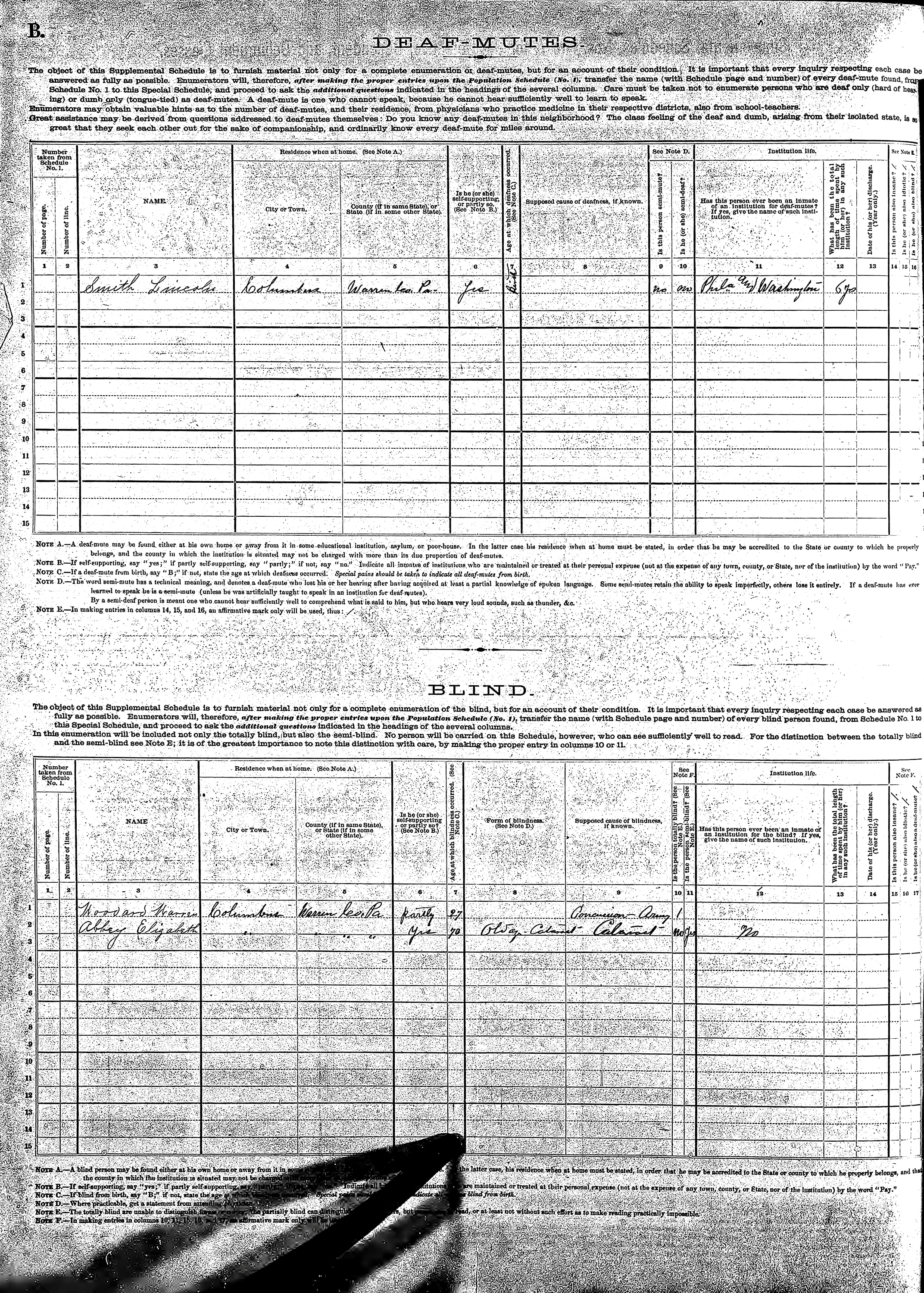 The 1880 Supplemental Census Report which shows that Elizabeth Abbey has cataracts due to old age, but is not totally blind.