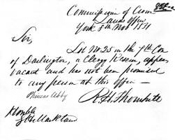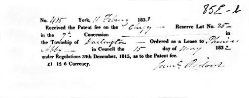 On September 21, 1812, Nathaniel Abbey petitioned for a lease on the broken front of Lot No. 25, in front of the 1st Concession of Hope Township, a Reserve.