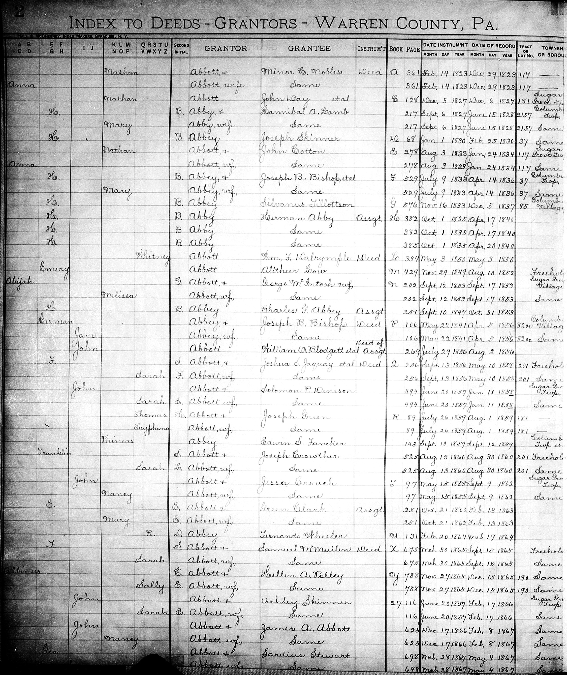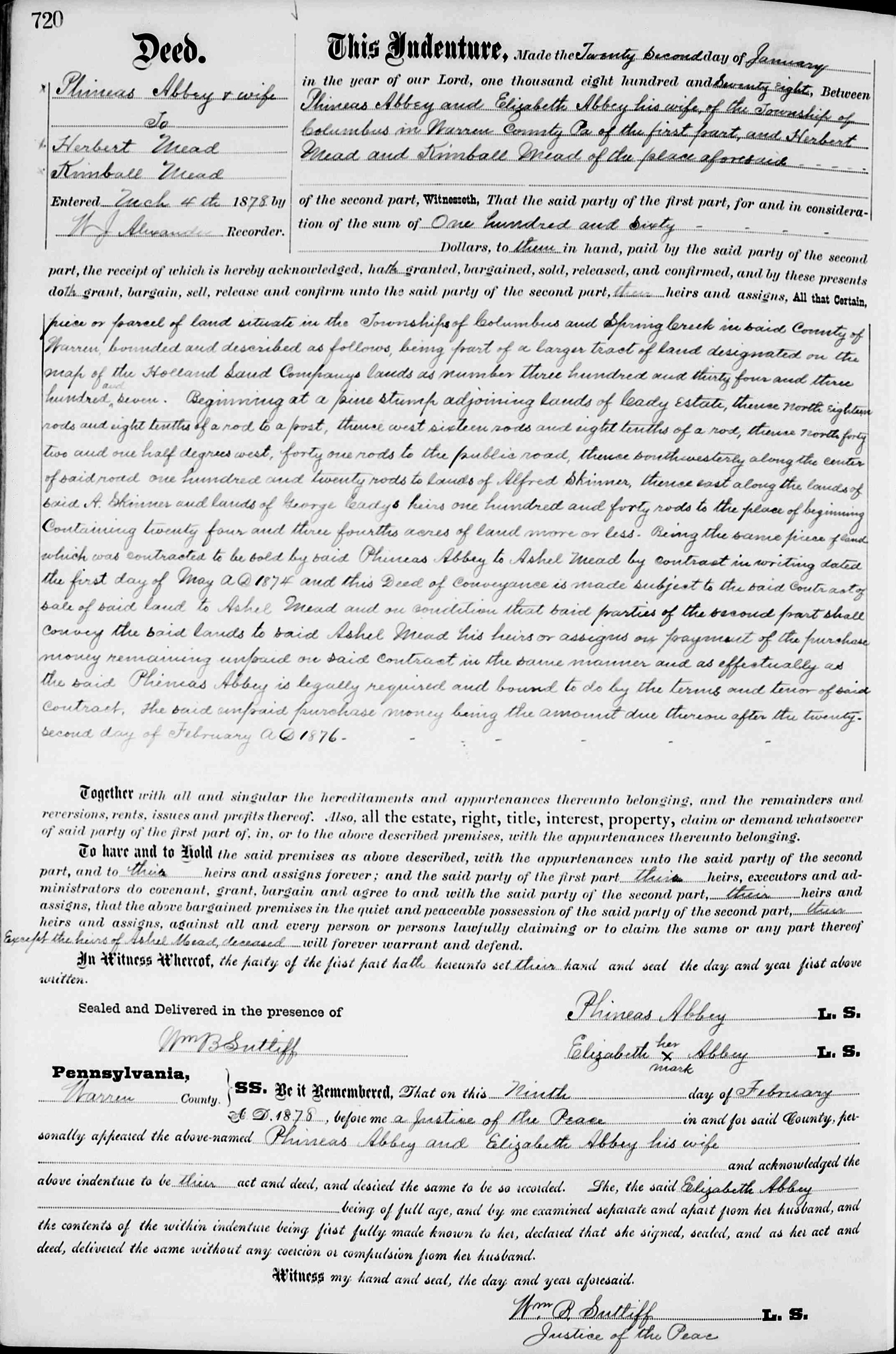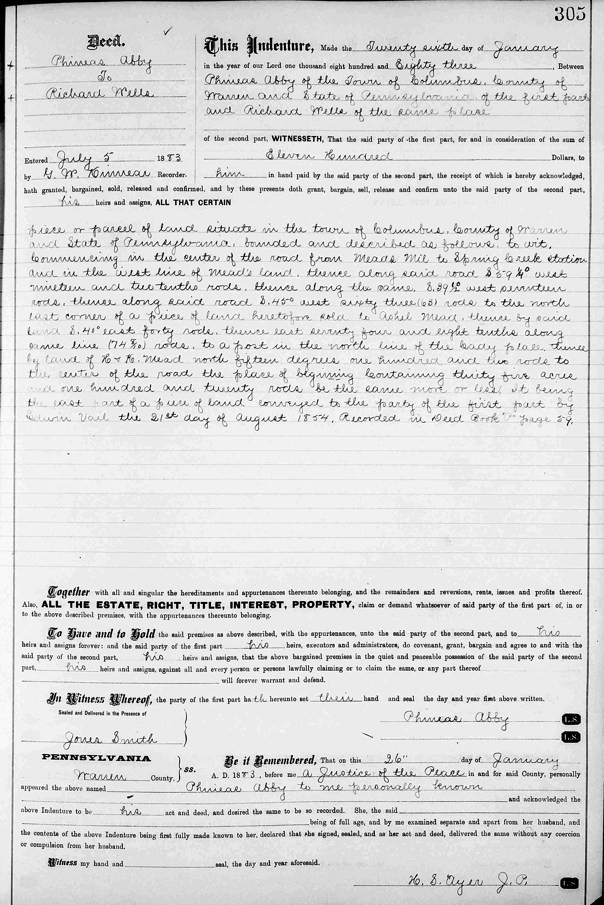 On January 26, 1883, Phineas Abbey Sold His Land in Columbus Twp., Warren Co., PA, to Richard Wells. Elizabeth (Fancher) (Altenburg) Abbey is not listed along with Phineas as one of the sellers. This Deed was recorded on July 5, 1883.
