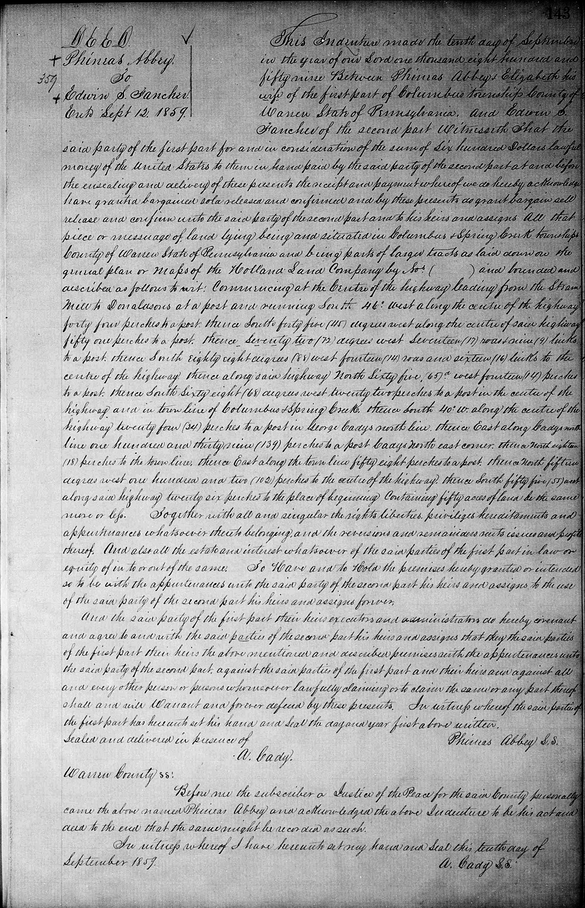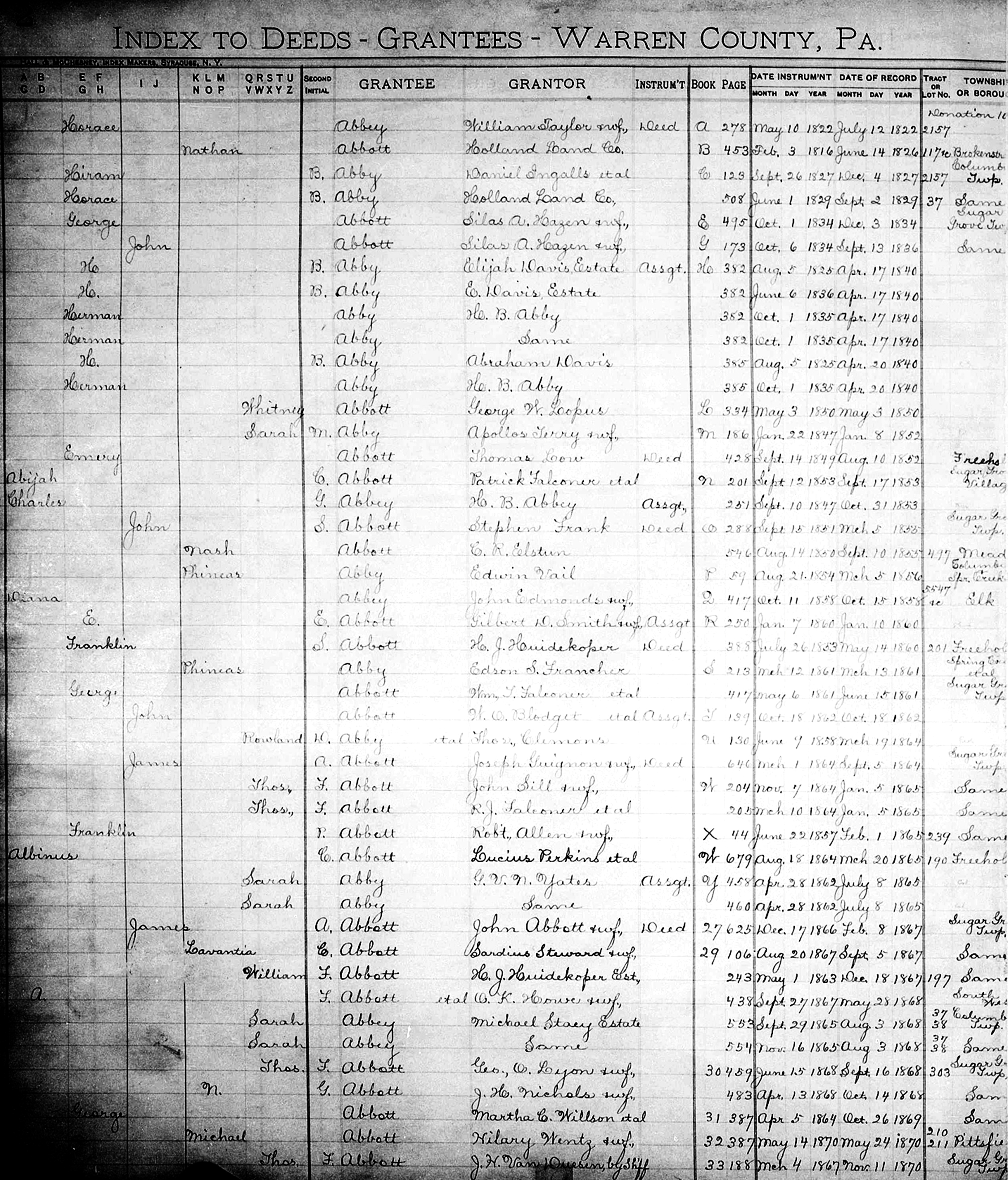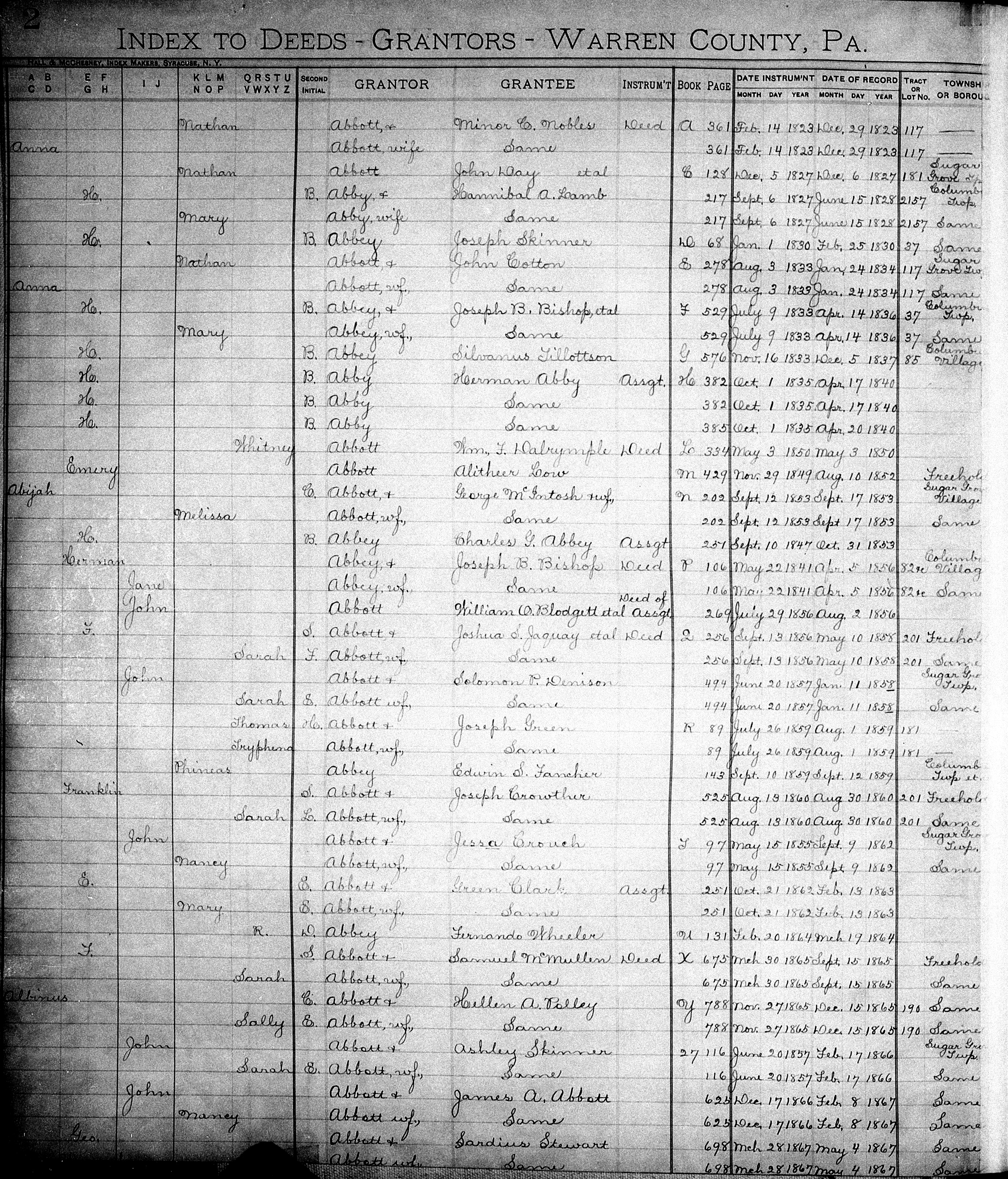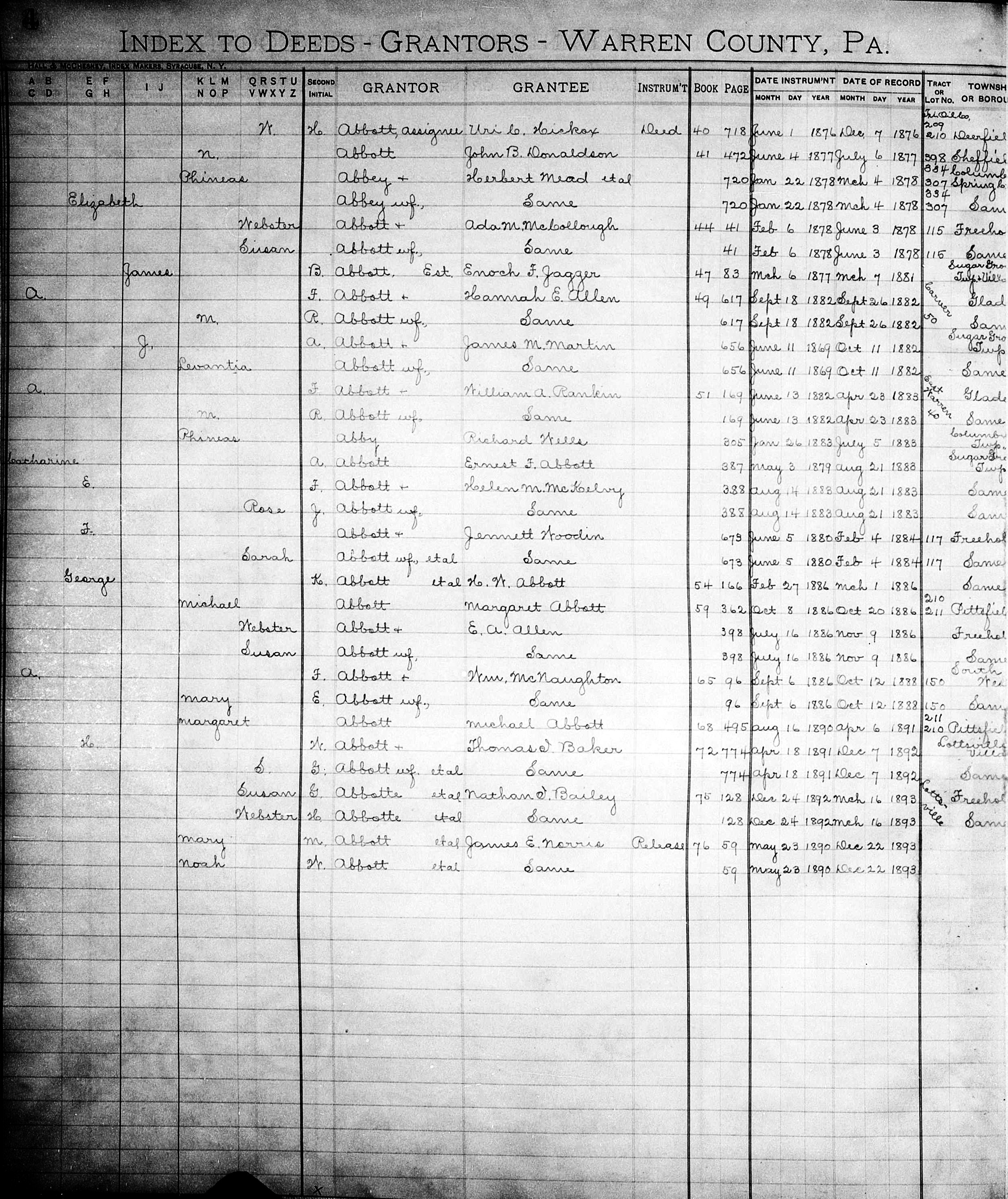 On January 26, 1883, Phineas Abbey Sold His Land in Columbus Twp., Warren Co., PA, to Richard Wells. Elizabeth (Fancher) (Altenburg) Abbey is not listed along with Phineas as one of the sellers. This Deed was recorded on July 5, 1883.
