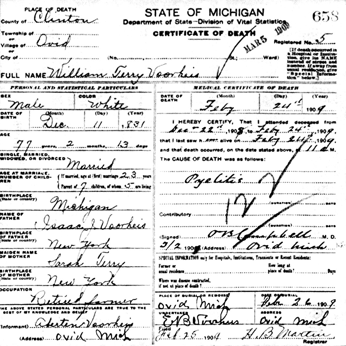 William Terry Voorhies Sr. died February 24, 1909, in the Village of Ovid, Clinton Co., MI. Buried in Ovid Cemetery, Ovid, Clinton Co., MI.