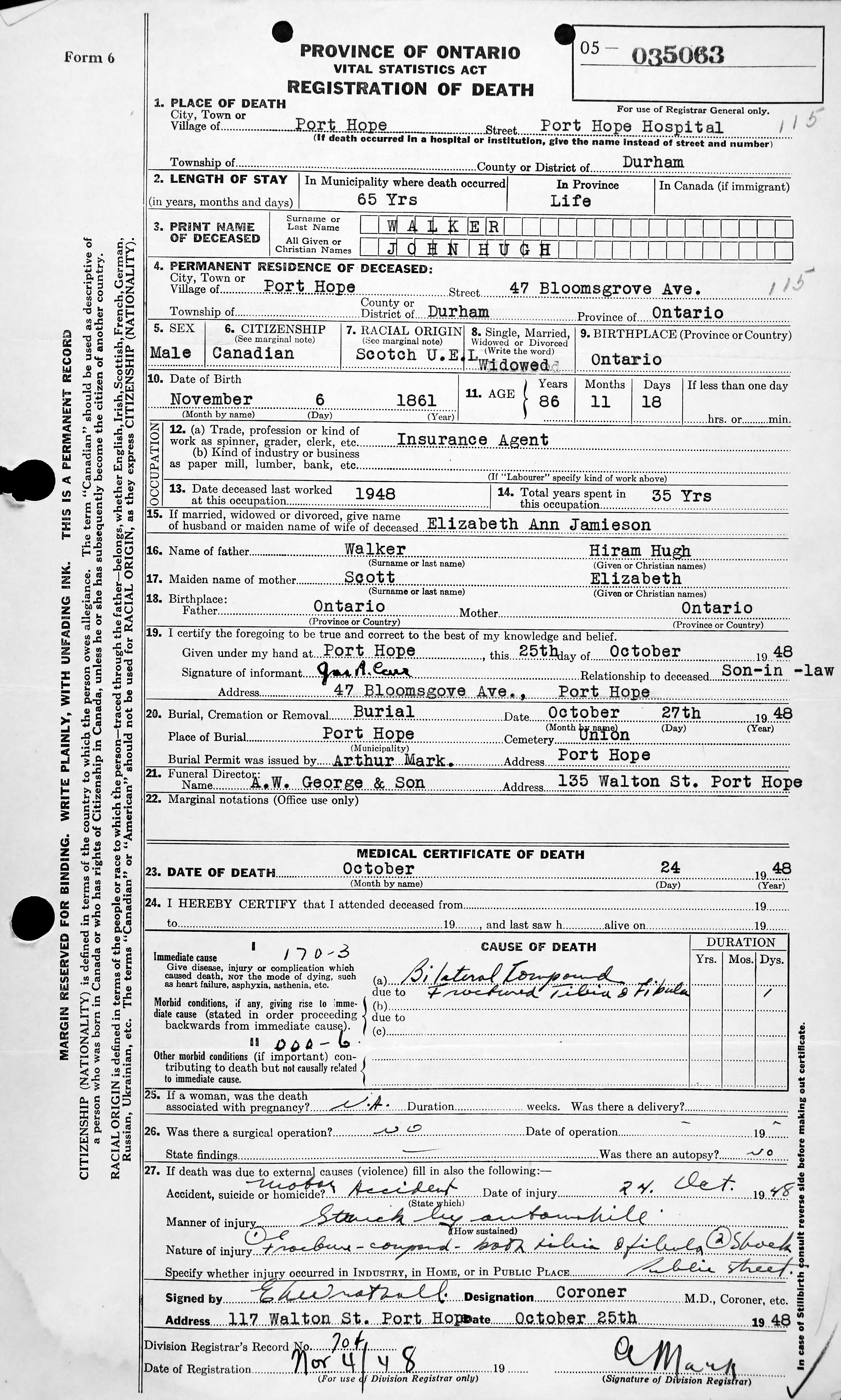 John Hugh Walker: Born November 6, 1861, in Canada West; Died October 24, 1948, at Port Hope Hospital, Port Hope, Durham Co., Ontario, Canada (age 86). Buried in Port Hope, Durham Co., Ontario, Canada.
