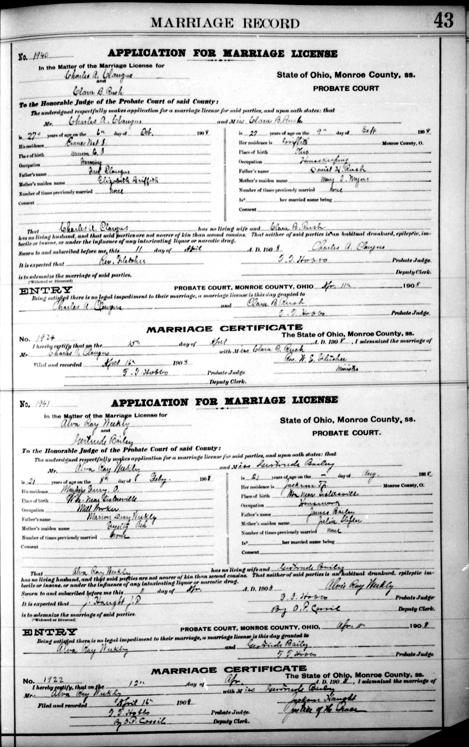 Alvie Ray Weekley and Myrtle Gertrude Bailey were married April 12, 1908, in Monroe Co., OH.